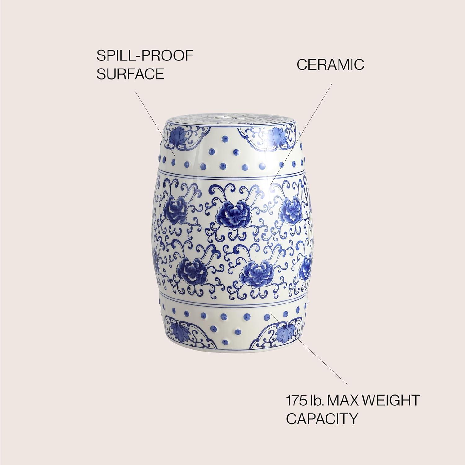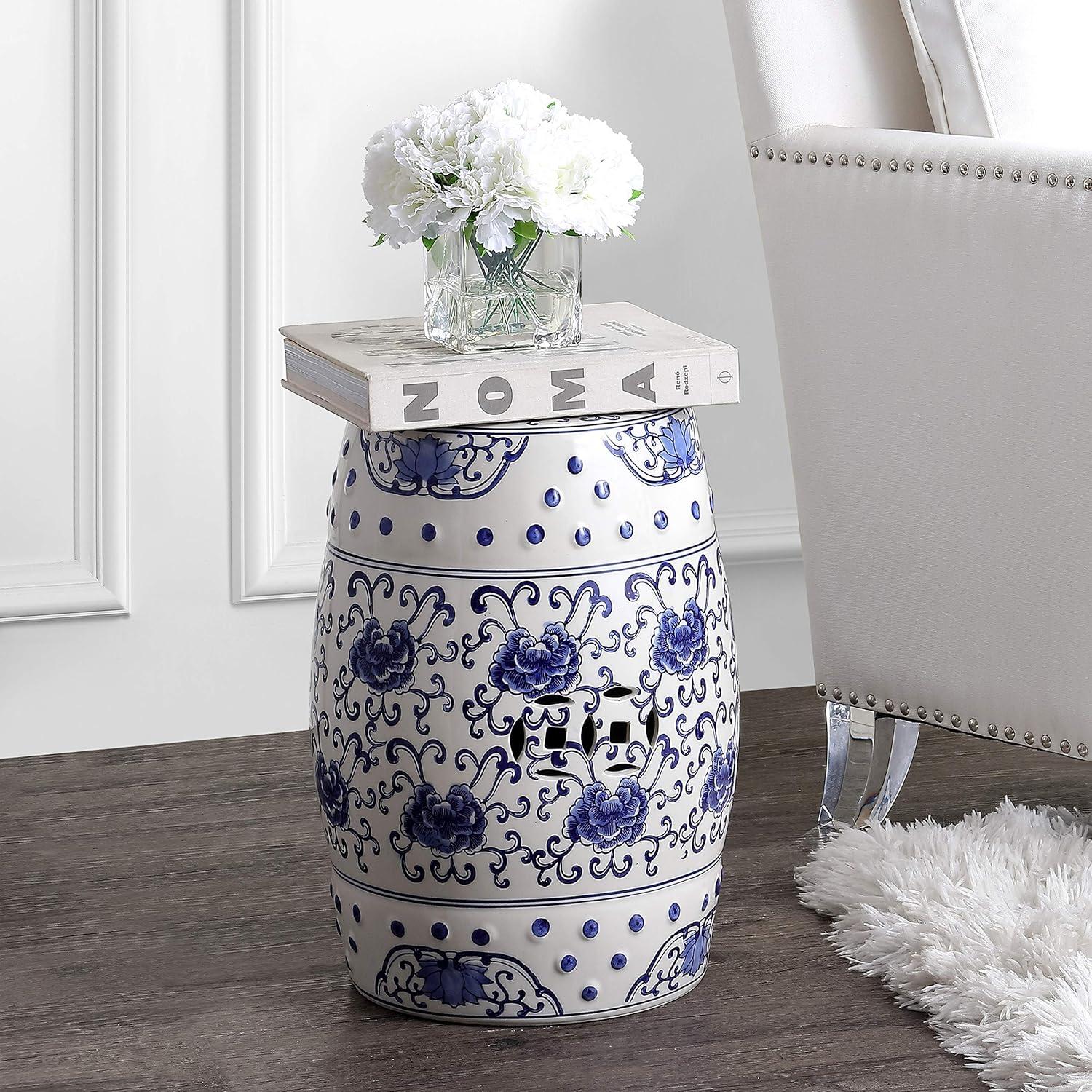 JONATHAN Y TBL1000A Lotus Flower 17.8″ Chinoiserie Ceramic Drum Indoor/Outdoor Garden Stool Bohemian, Coastal, Classic, Cottage, French Country, Traditional, Bathroom, Garden Room, Patio, Blue/White
