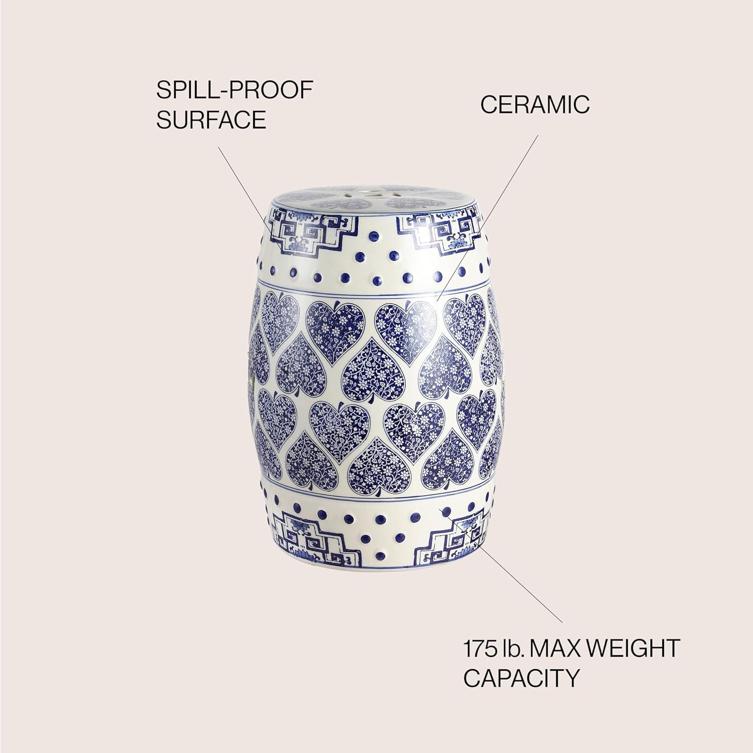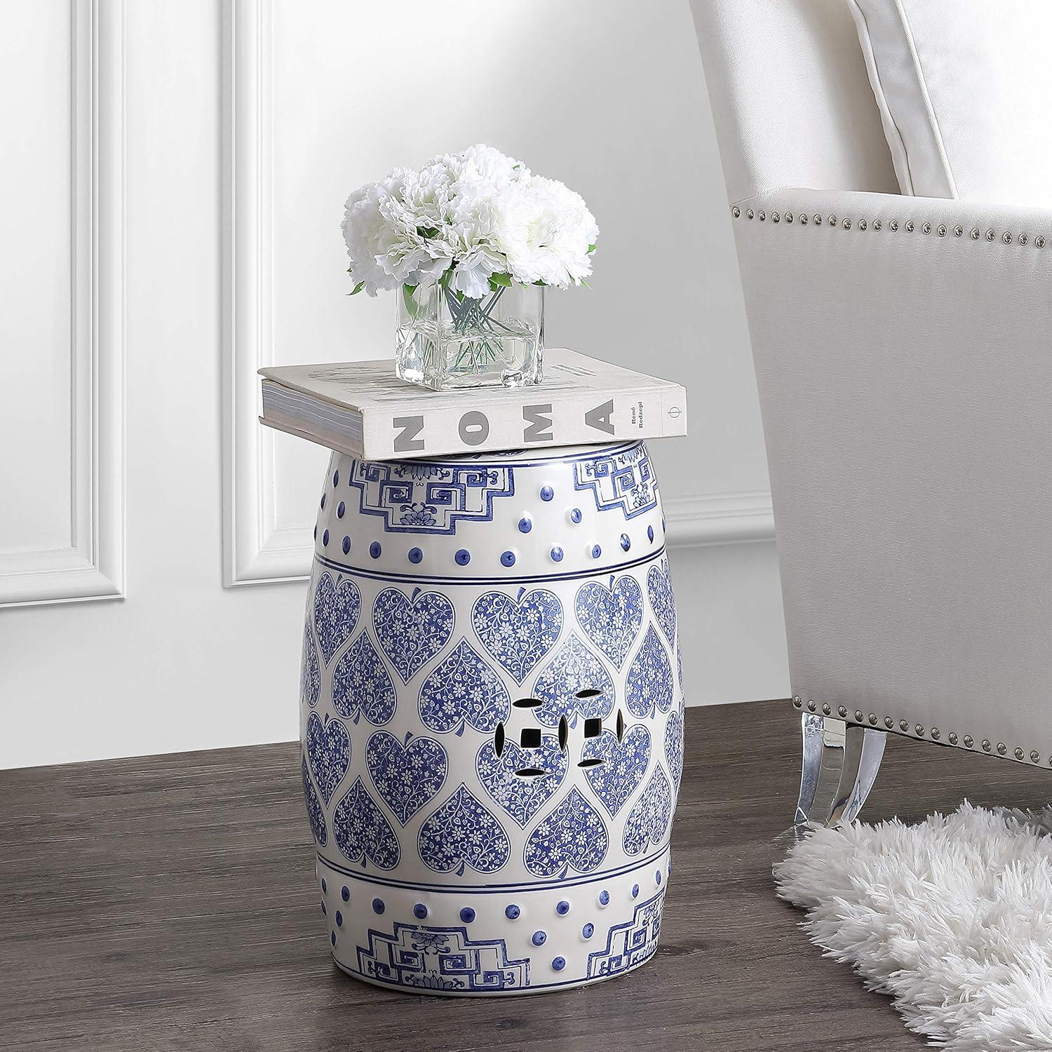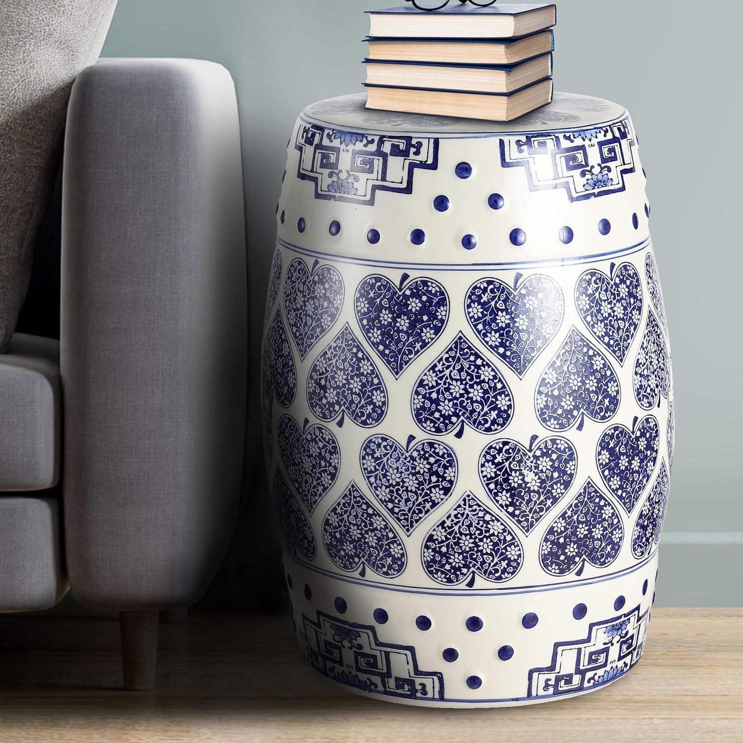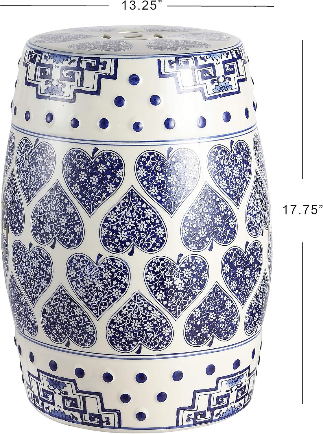 JONATHAN Y TBL1014A Happy Hearts 17.8″ Chinoiserie Ceramic Drum Indoor/Outdoor Garden Stool, Bohemian, Coastal, Cottage, French Country, Traditional, Side Table, Plant Stand, Spill-Proof, Blue/White