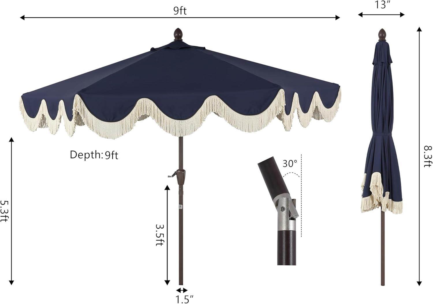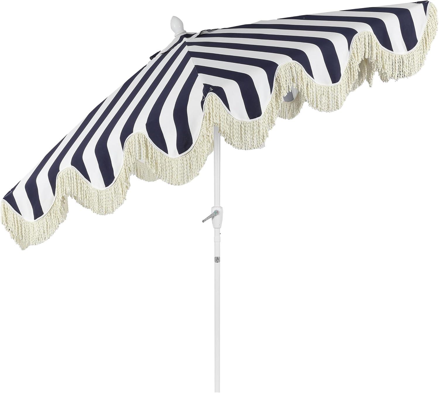 JONATHAN Y UMB1001 Collins 9 ft. Classic Cottage Tassel Market Patio Umbrella with Auto-Tilt, Crank, Wind Vent and UV Protection(Navy/Cream)