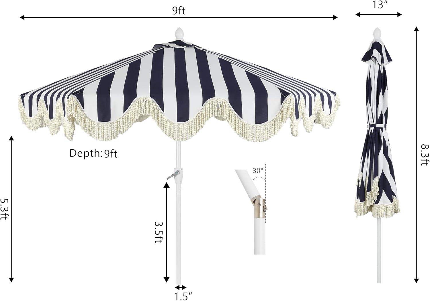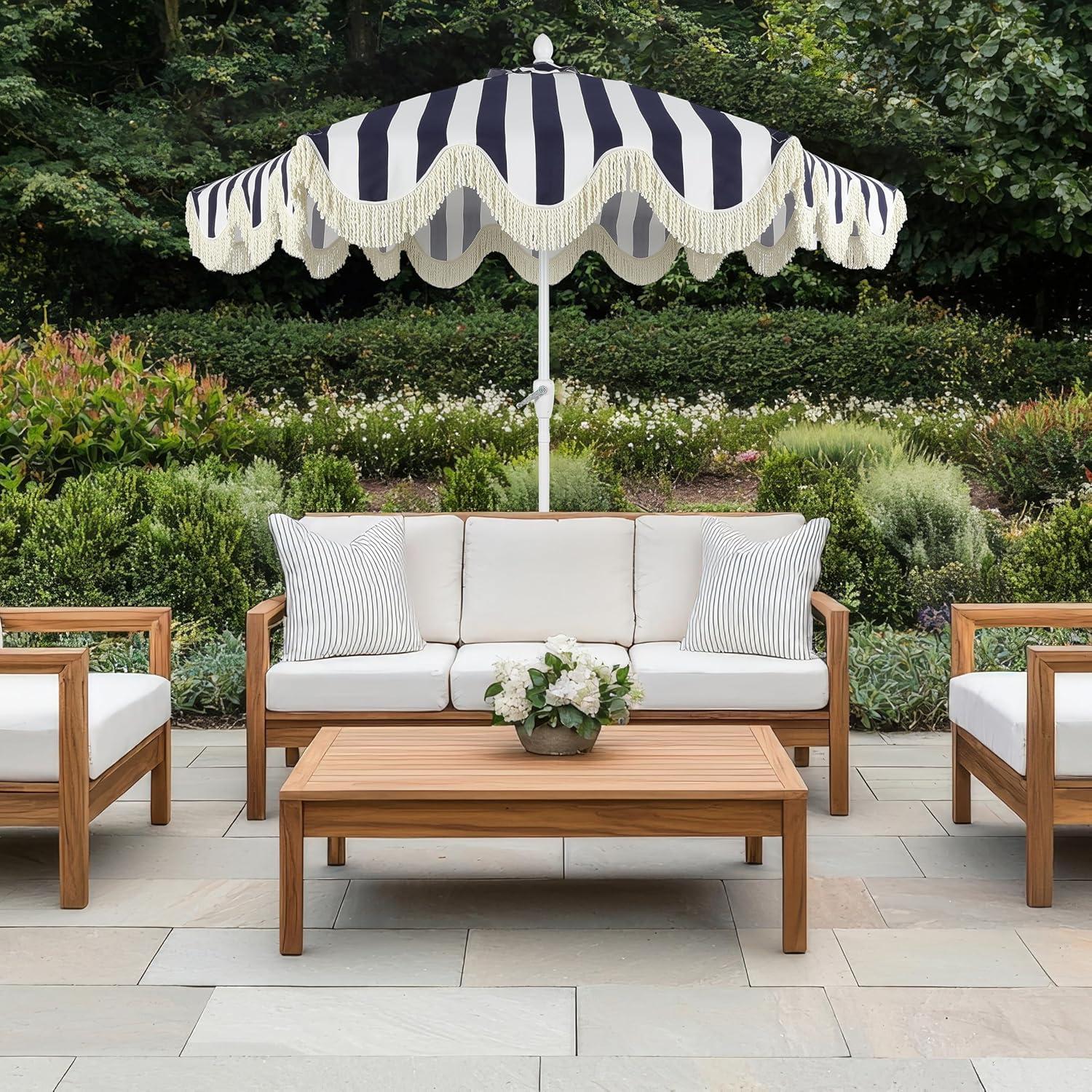 JONATHAN Y UMB1001 Collins 9 ft. Classic Cottage Tassel Market Patio Umbrella with Auto-Tilt, Crank, Wind Vent and UV Protection(Navy/White/Cream)