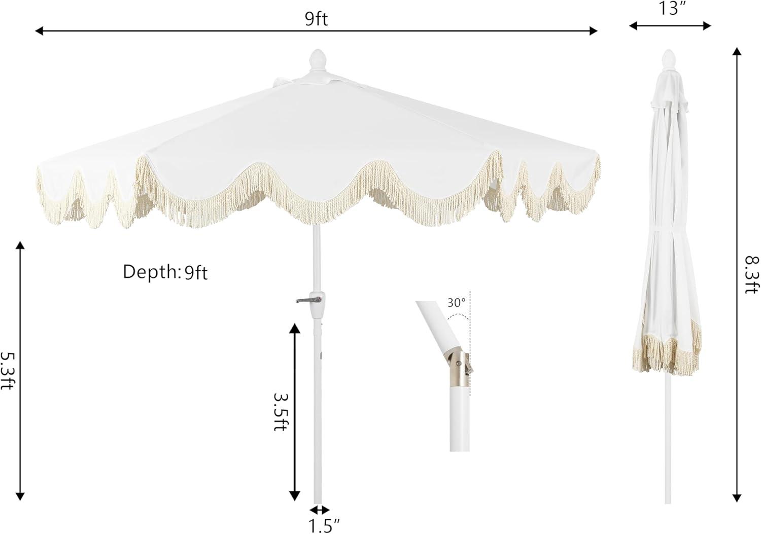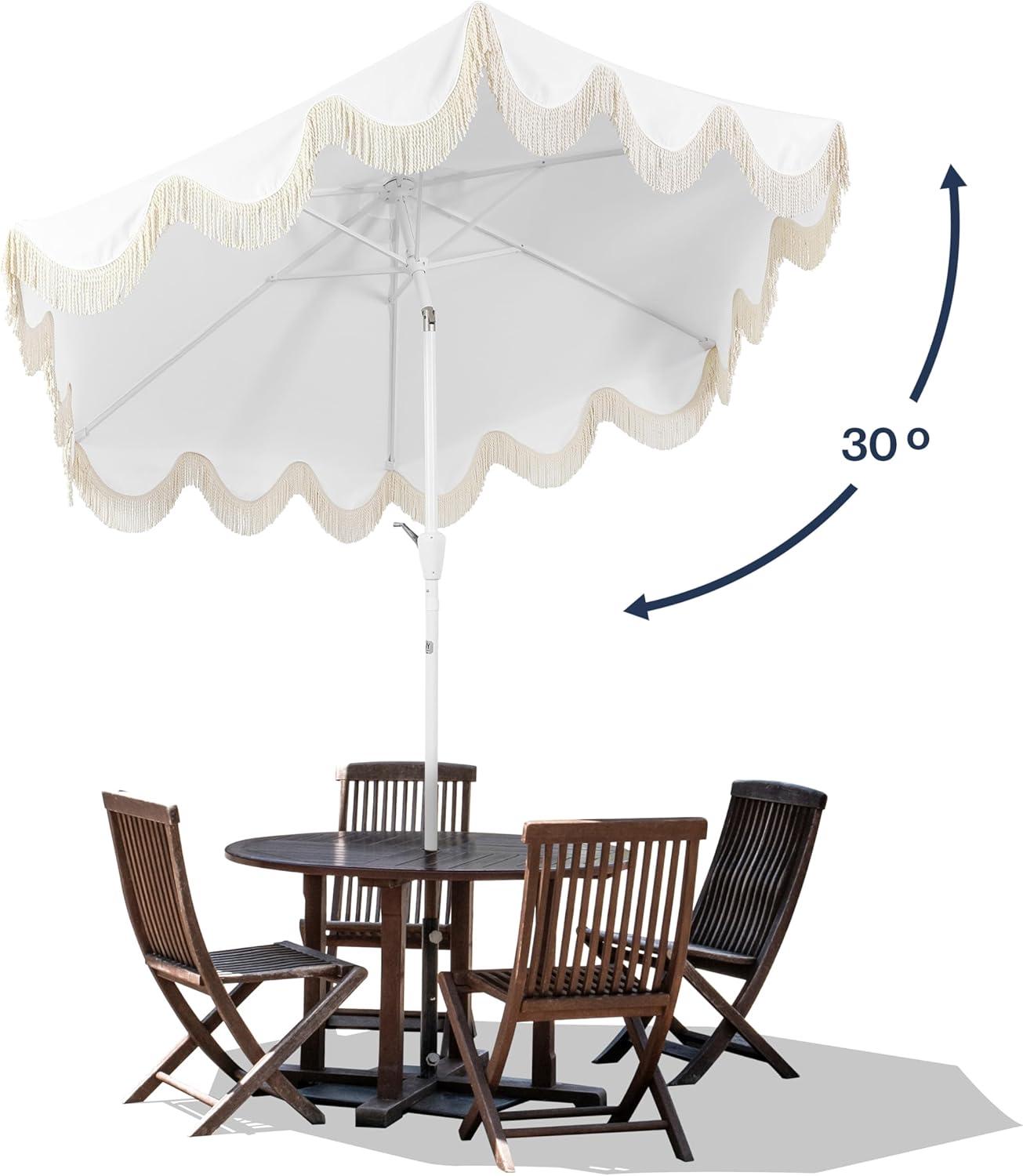 JONATHAN Y UMB1001 Collins 9 ft. Classic Cottage Tassel Market Patio Umbrella with Auto-Tilt, Crank, Wind Vent and UV Protection(White)