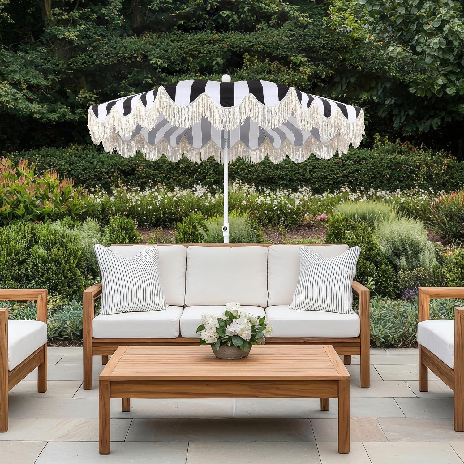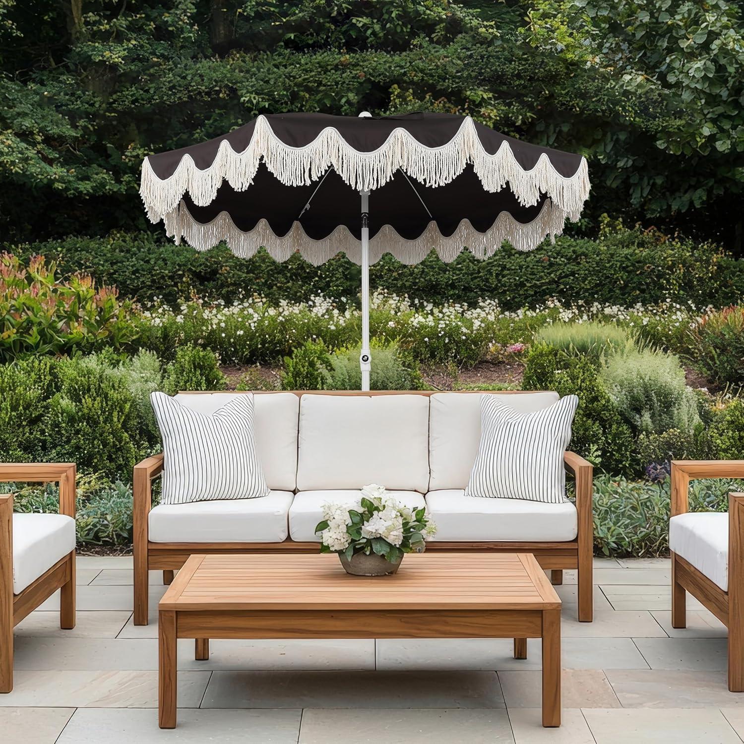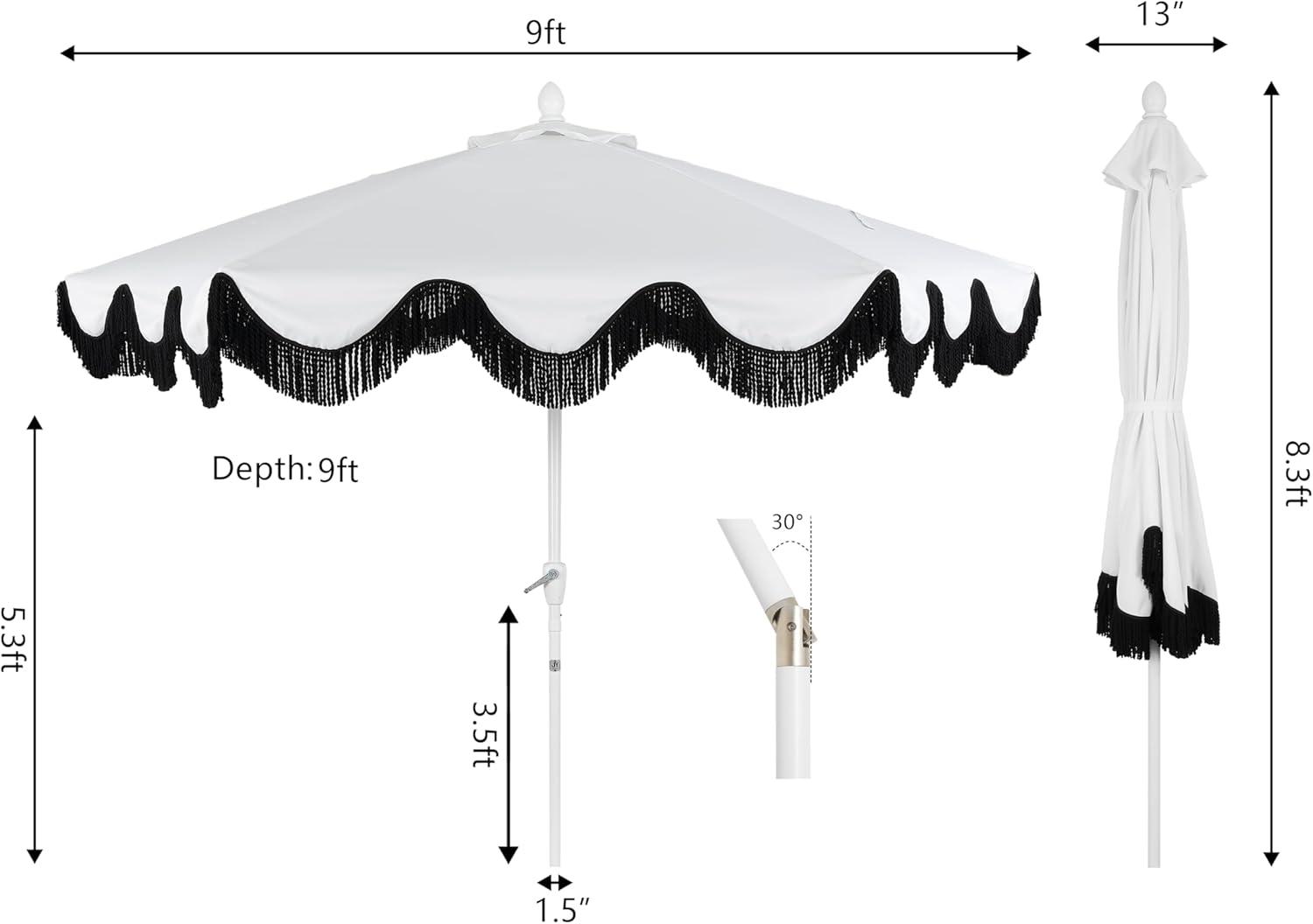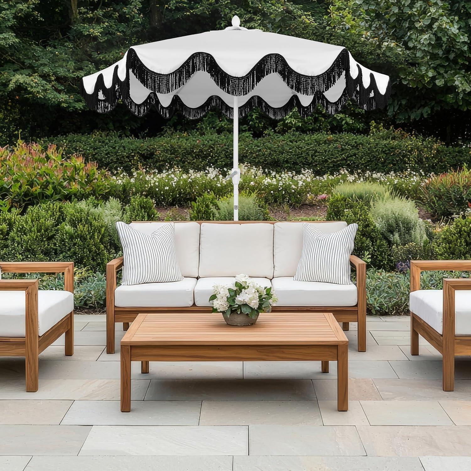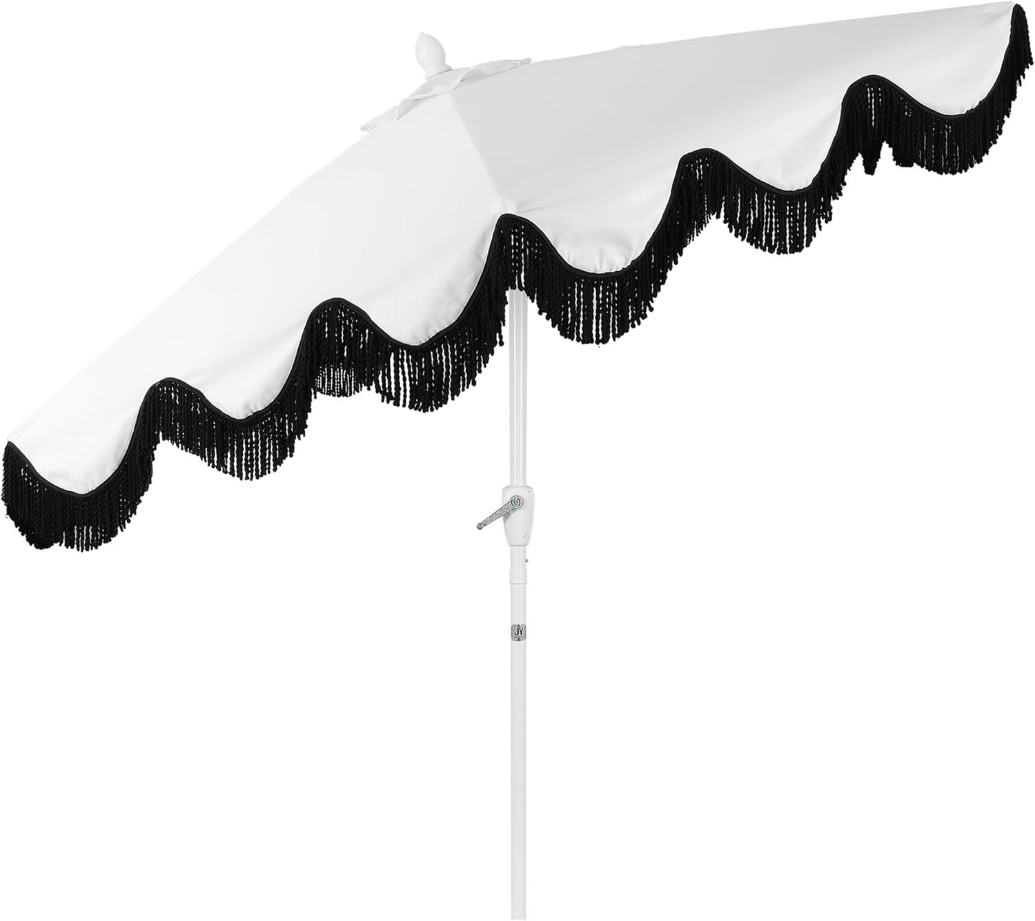JONATHAN Y UMB1001 Collins 9 ft. Classic Cottage Tassel Market Patio Umbrella with Auto-Tilt, Crank, Wind Vent and UV Protection(White/Black)