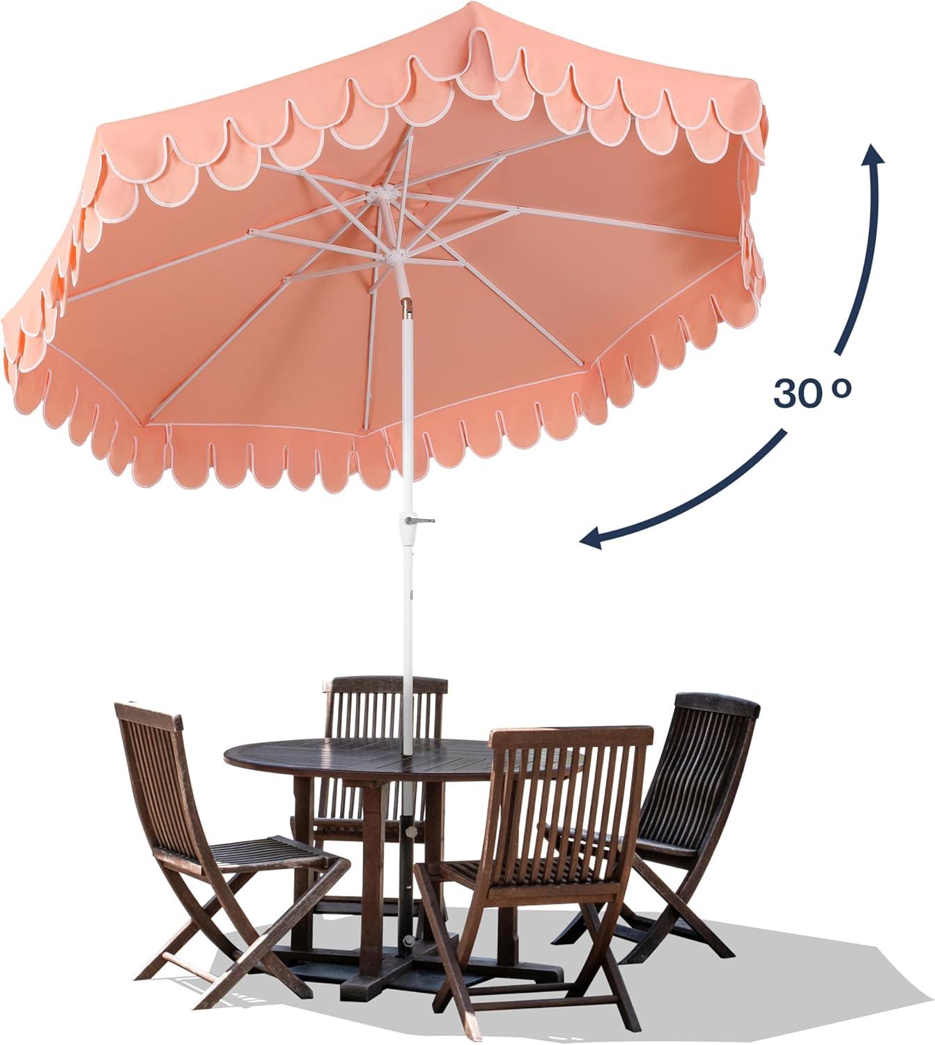 JONATHAN Y UMB1002F Tracy 9 ft. Classic MidCentury Scalloped Fringe Market Patio Umbrella with Auto-Tilt Crank, Wind Vent and UV Protection in Coral Red/White, White Pole(Coral Pink)