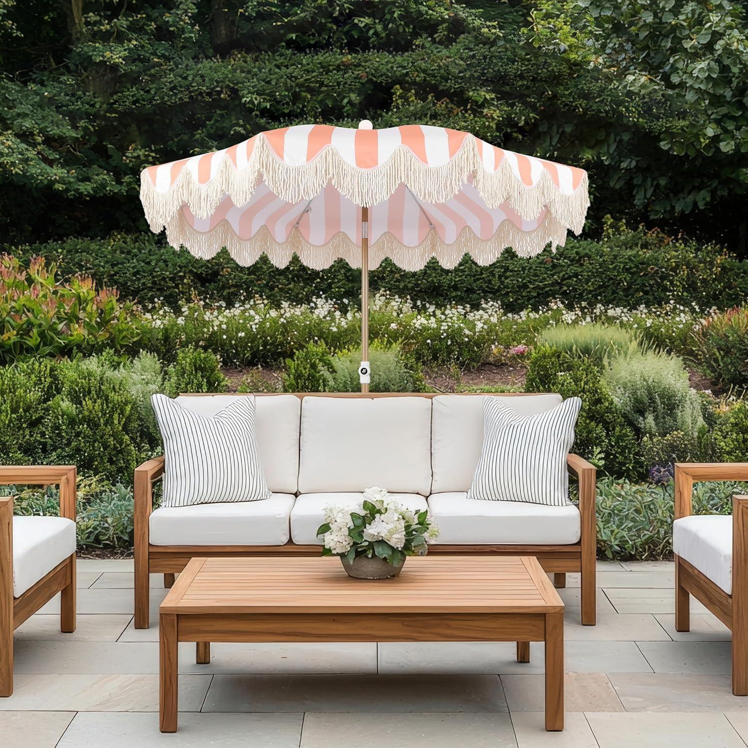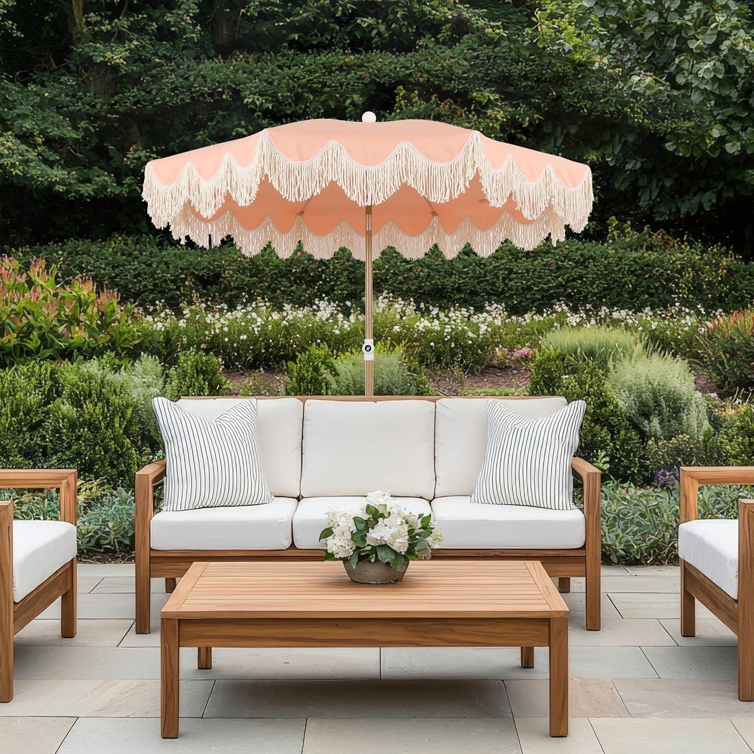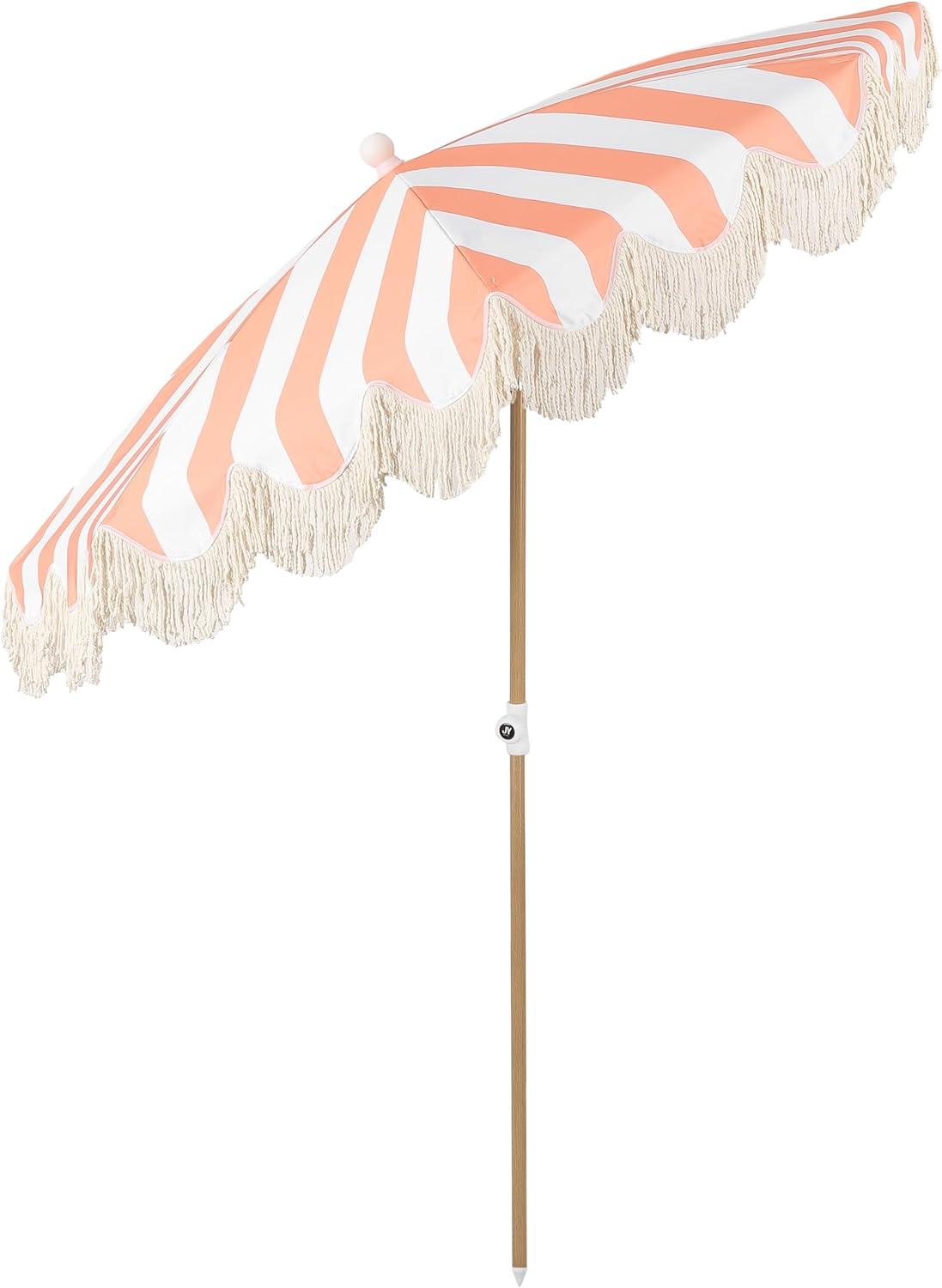JONATHAN Y UMB1005E Mariner 6.5 ft. Classic Cottage Fringe Tassel Market Beach Umbrella with Push Button Tilt, Wind Vent and UV Protection, and Matching Carry Bag in Cream, White Pole(Coral Pink)