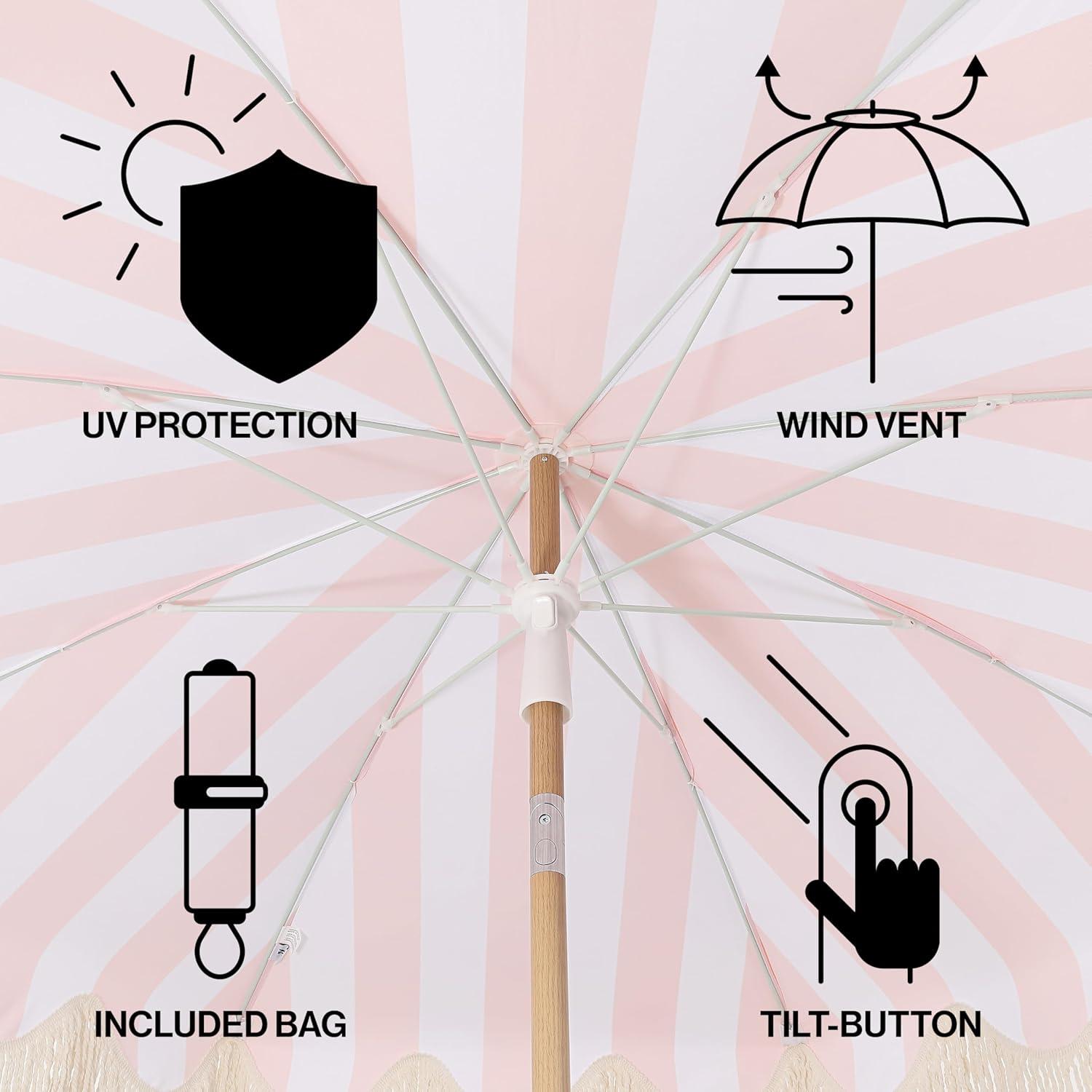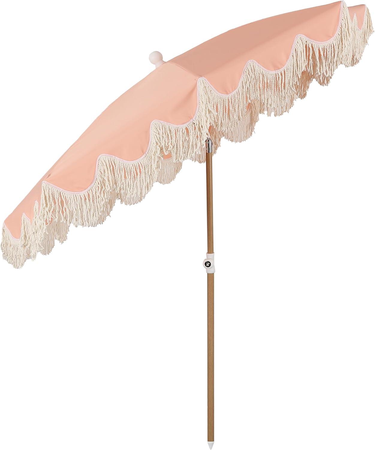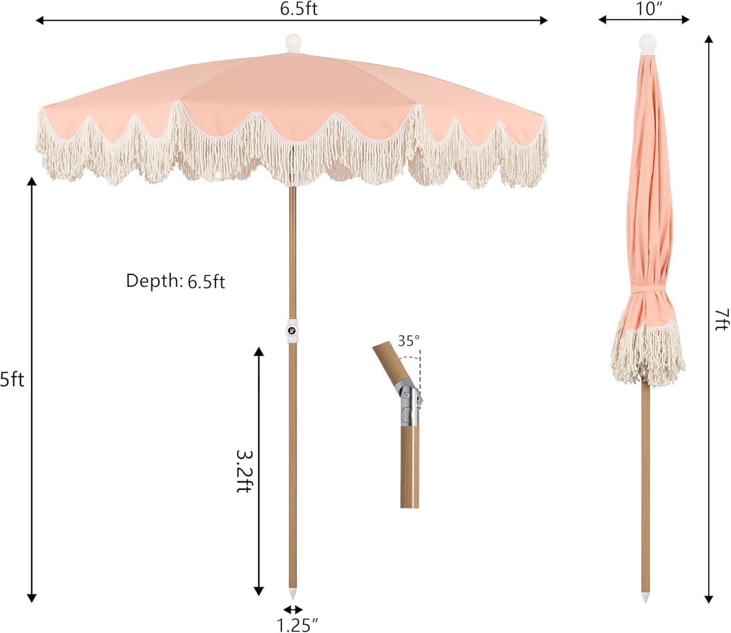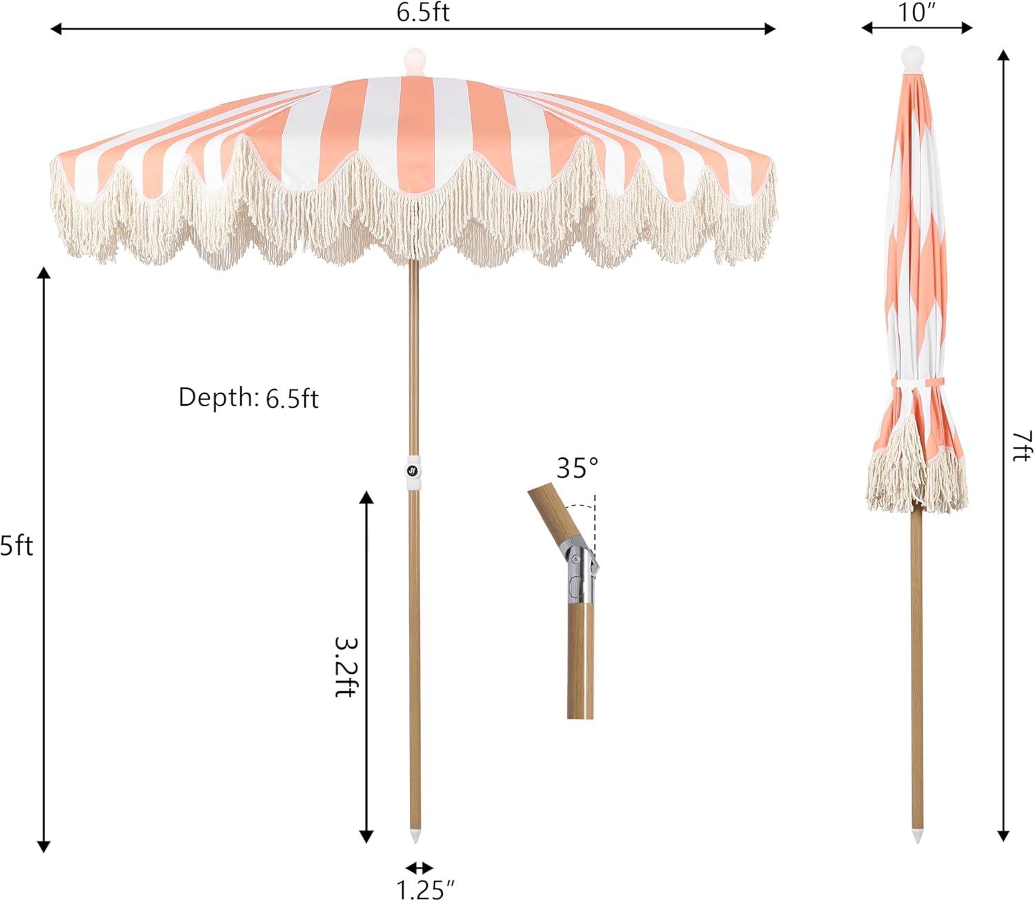 JONATHAN Y UMB1005E Mariner 6.5 ft. Classic Cottage Fringe Tassel Market Beach Umbrella with Push Button Tilt, Wind Vent and UV Protection, and Matching Carry Bag in Cream, White Pole(Coral Pink)
