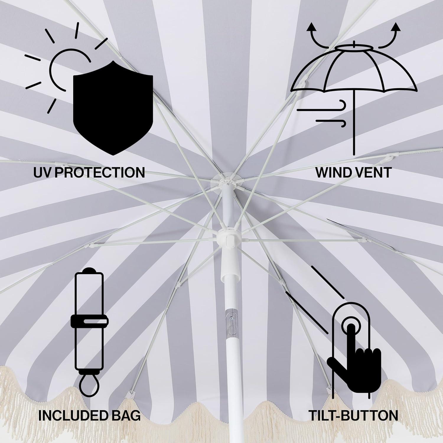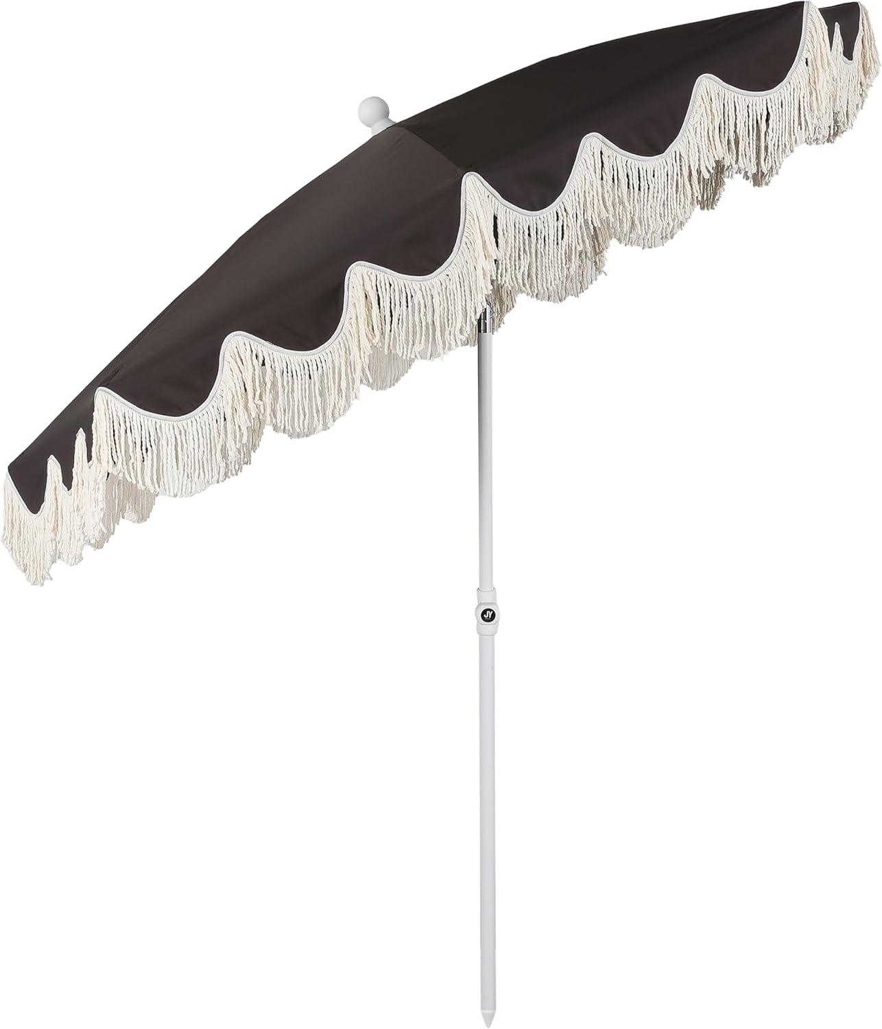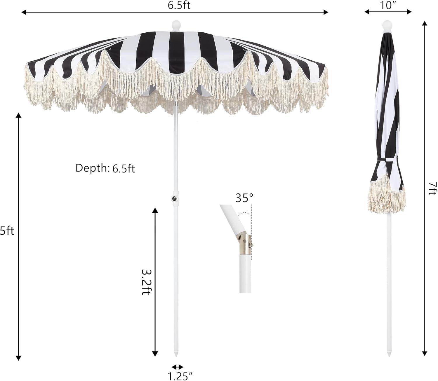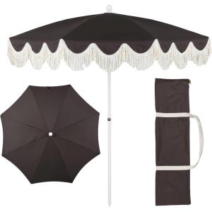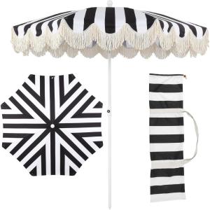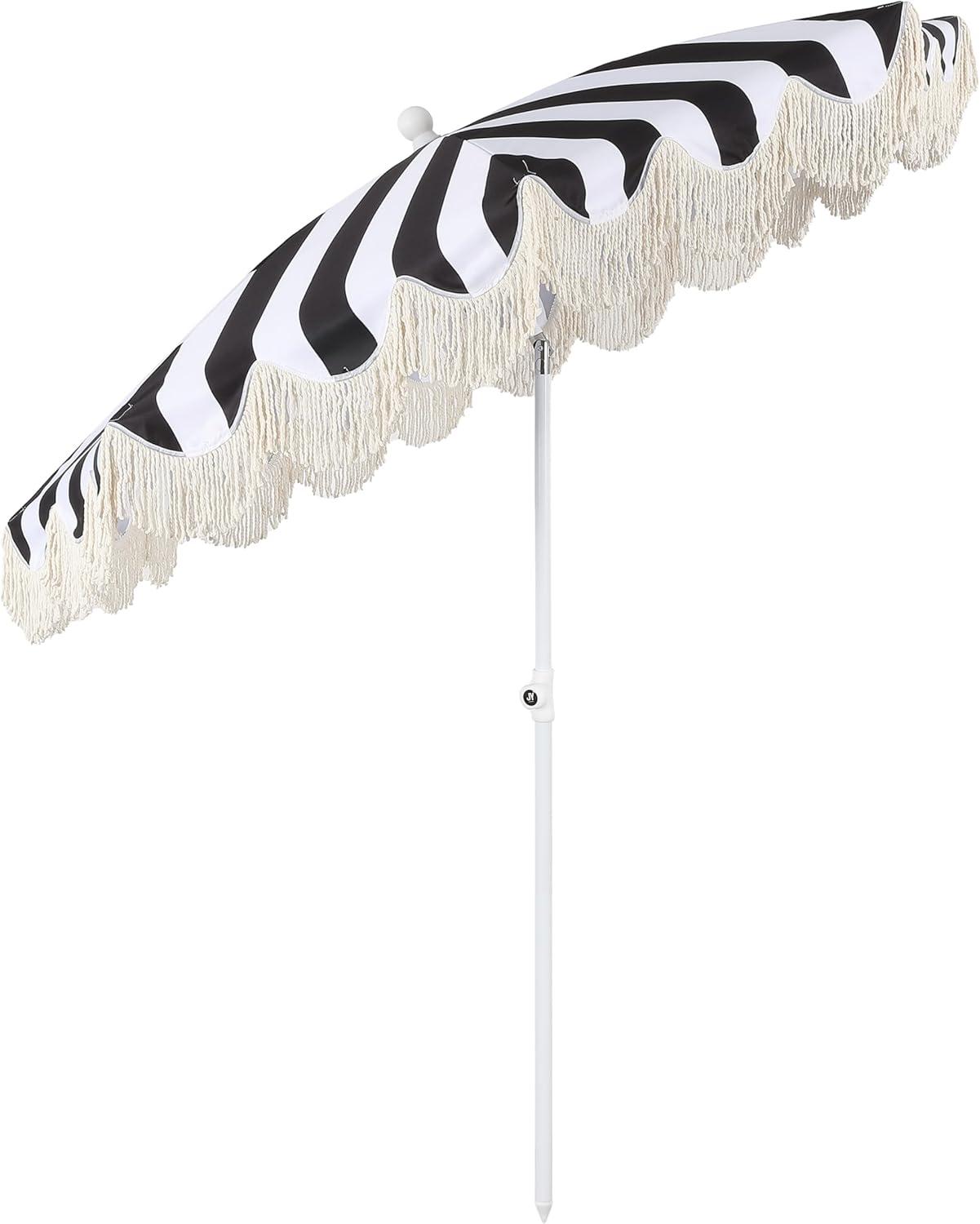 JONATHAN Y UMB1005E Mariner 6.5 ft. Classic Cottage Fringe Tassel Market Beach Umbrella with Push Button Tilt, Wind Vent and UV Protection, and Matching Carry Bag in Cream, White Pole(Black/White)