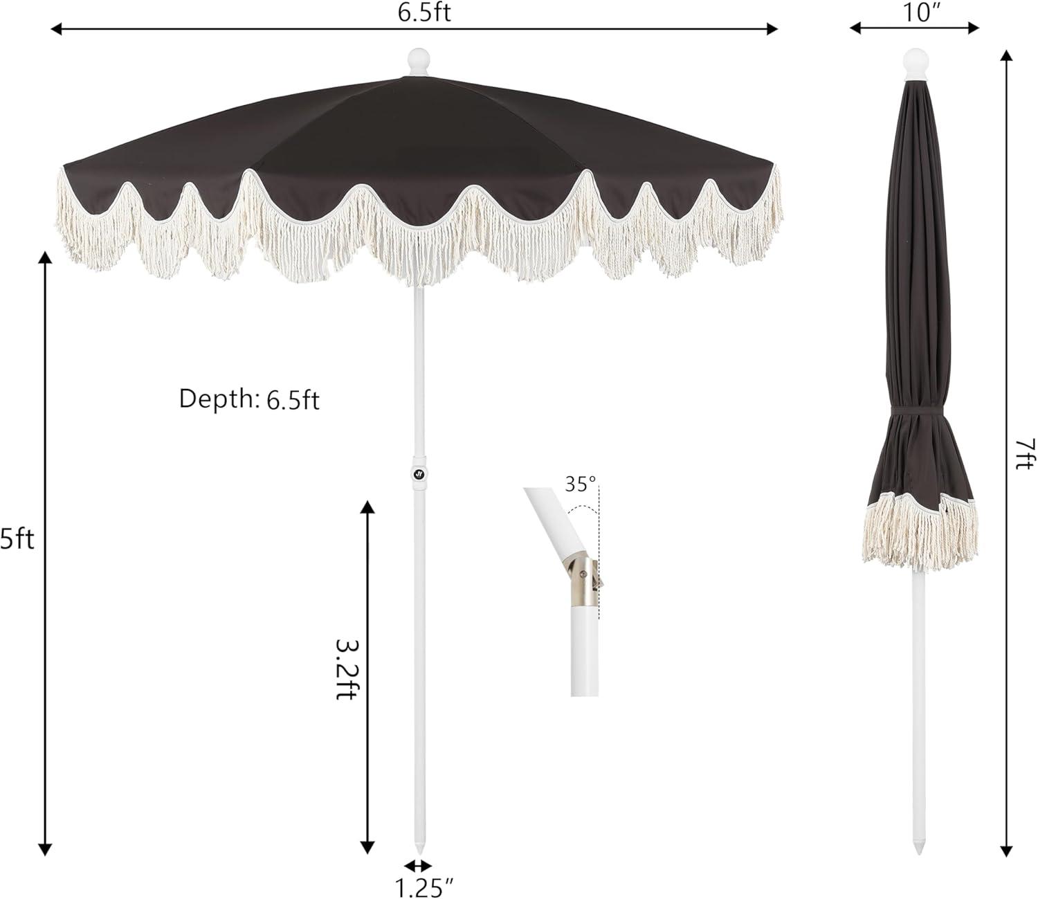 JONATHAN Y UMB1005E Mariner 6.5 ft. Classic Cottage Fringe Tassel Market Beach Umbrella with Push Button Tilt, Wind Vent and UV Protection, and Matching Carry Bag in Cream, White Pole(Black)