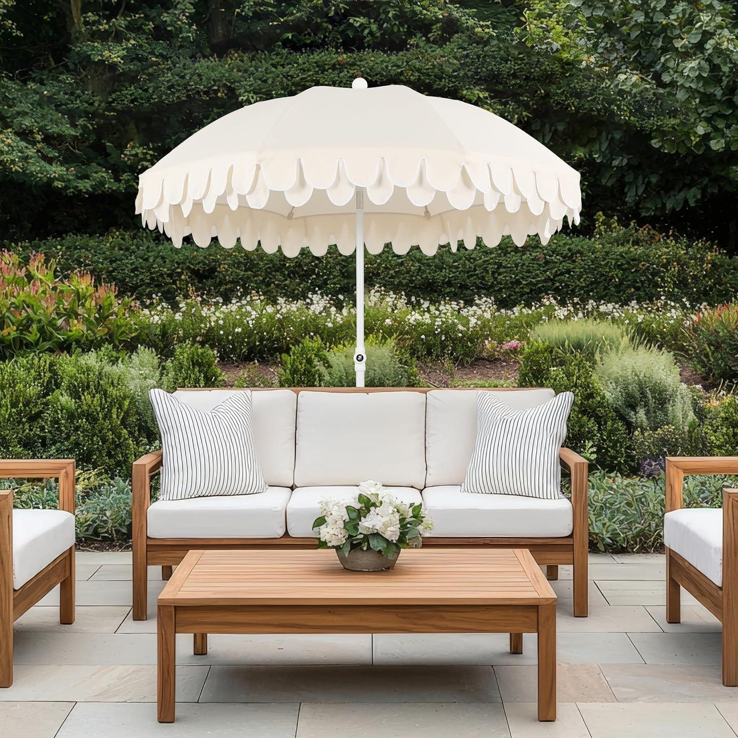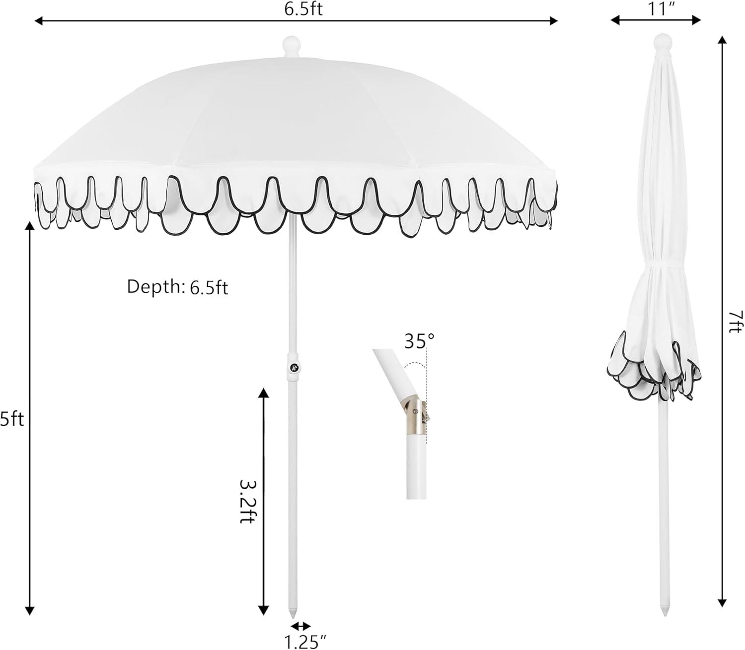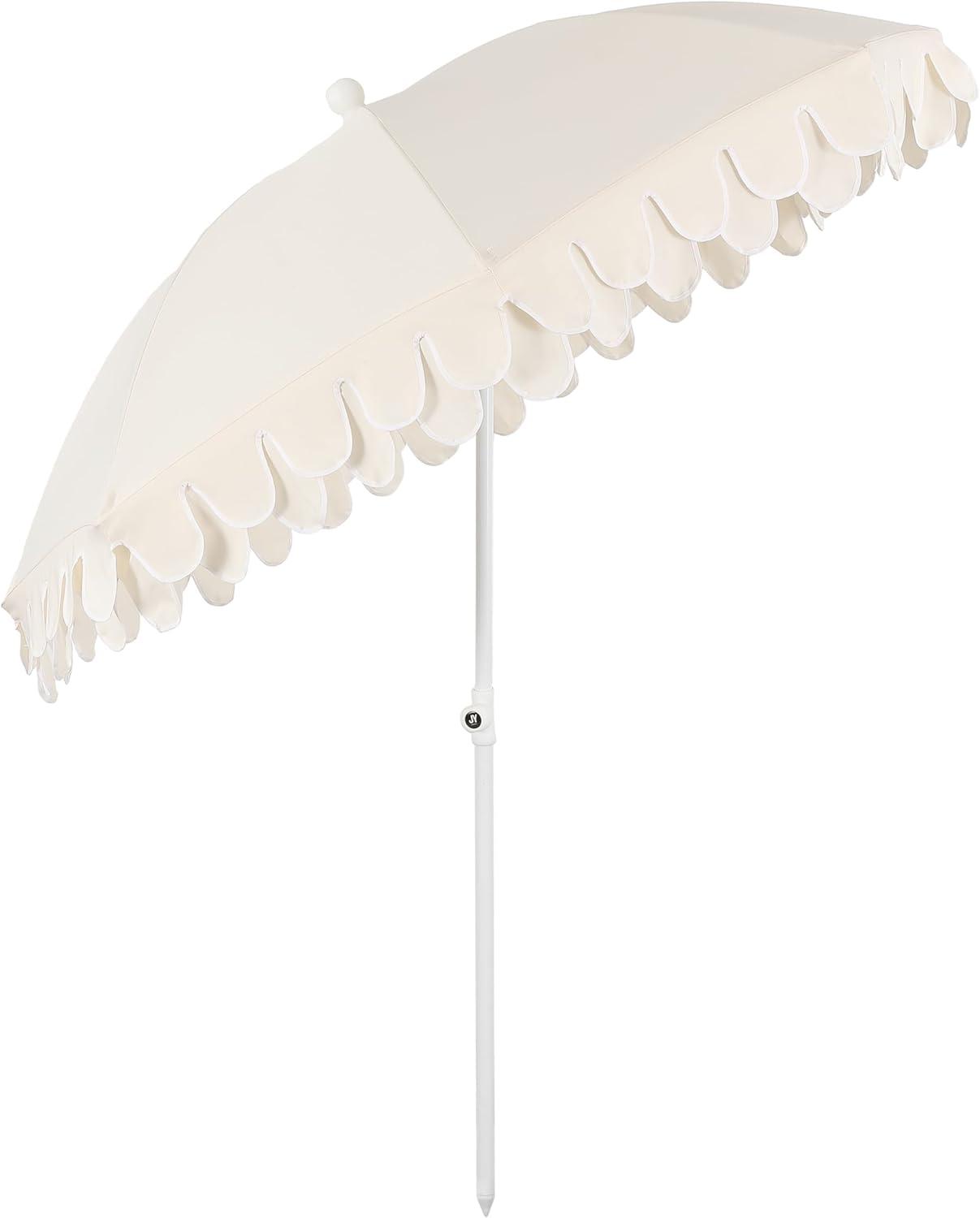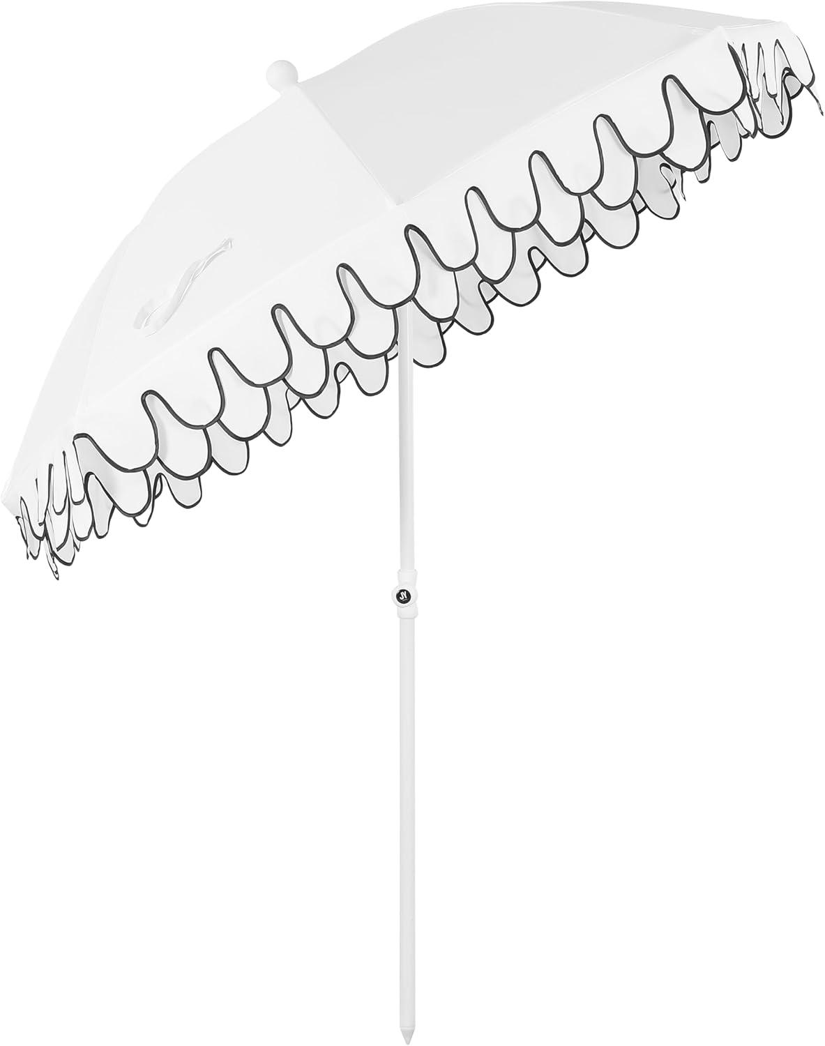 JONATHAN Y UMB1004H Horizon 6.5 ft. Classic MidCentury Scalloped Fringe Market Beach Umbrella with Push-Button Tilt, Wind Vent and UV Protection, and Matching Carry Bag in Coral Pink/White, Brown Pole(White)