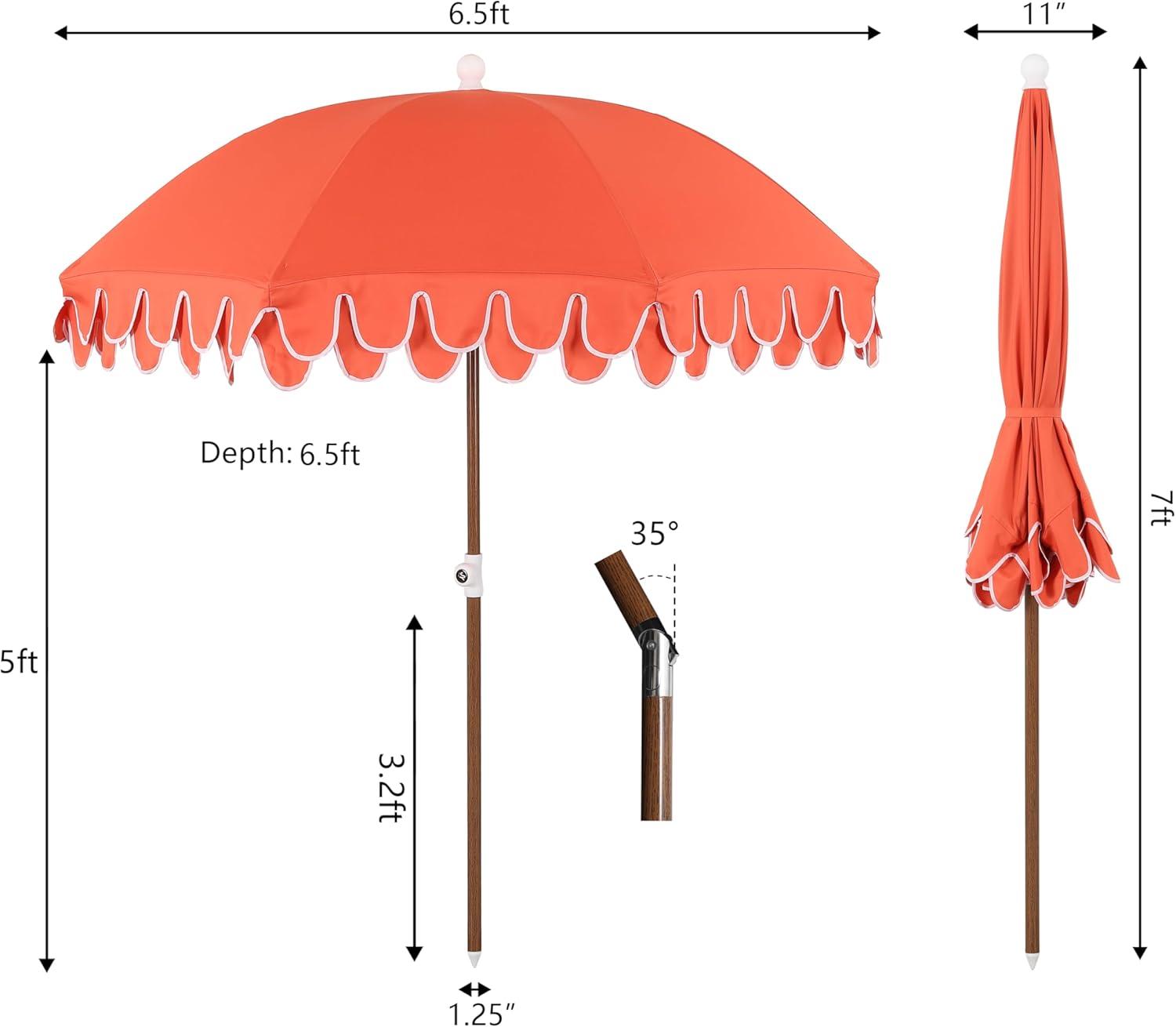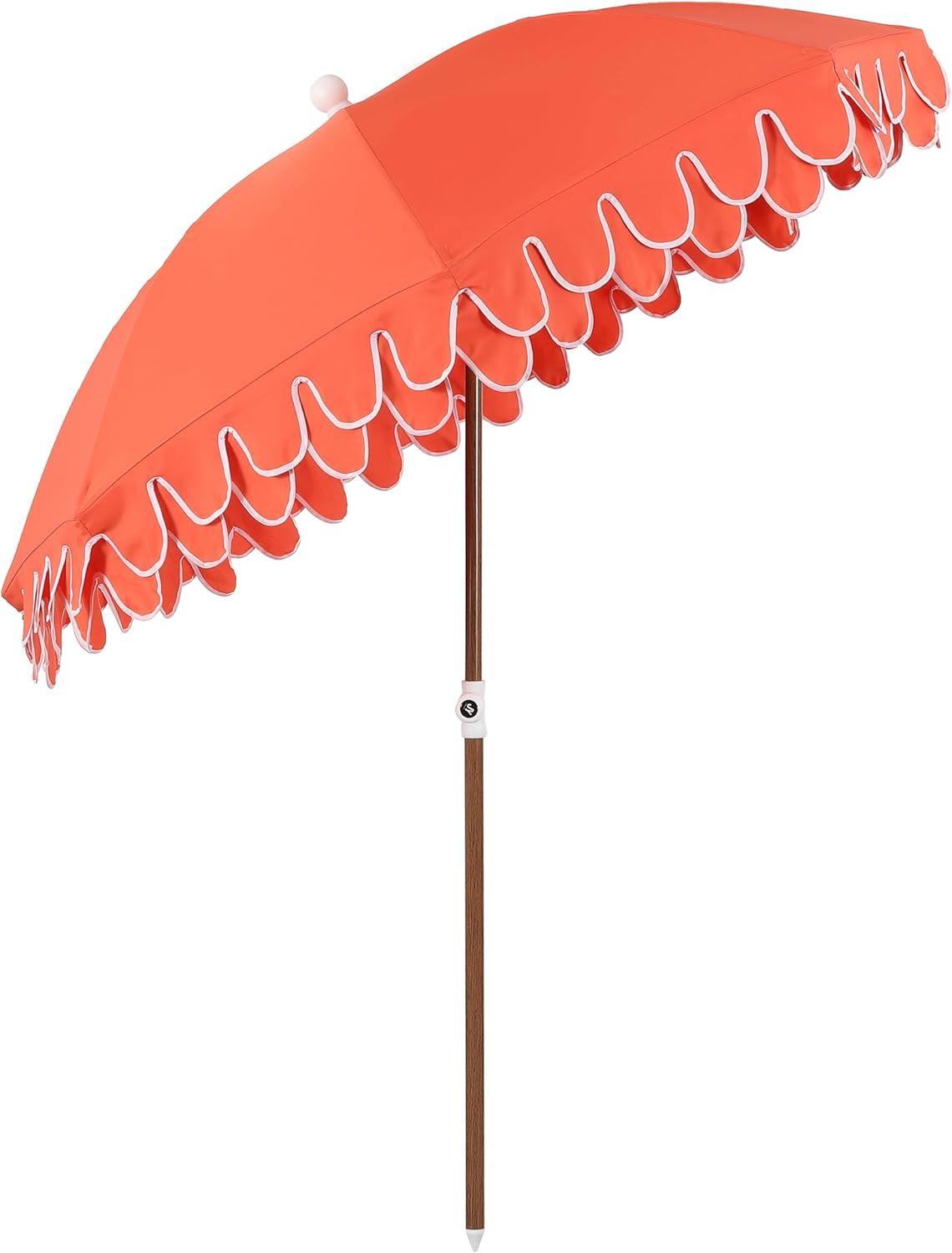 JONATHAN Y UMB1004H Horizon 6.5 ft. Classic MidCentury Scalloped Fringe Market Beach Umbrella with Push-Button Tilt, Wind Vent and UV Protection, and Matching Carry Bag in Coral Pink/White, Brown Pole(Coral Red)