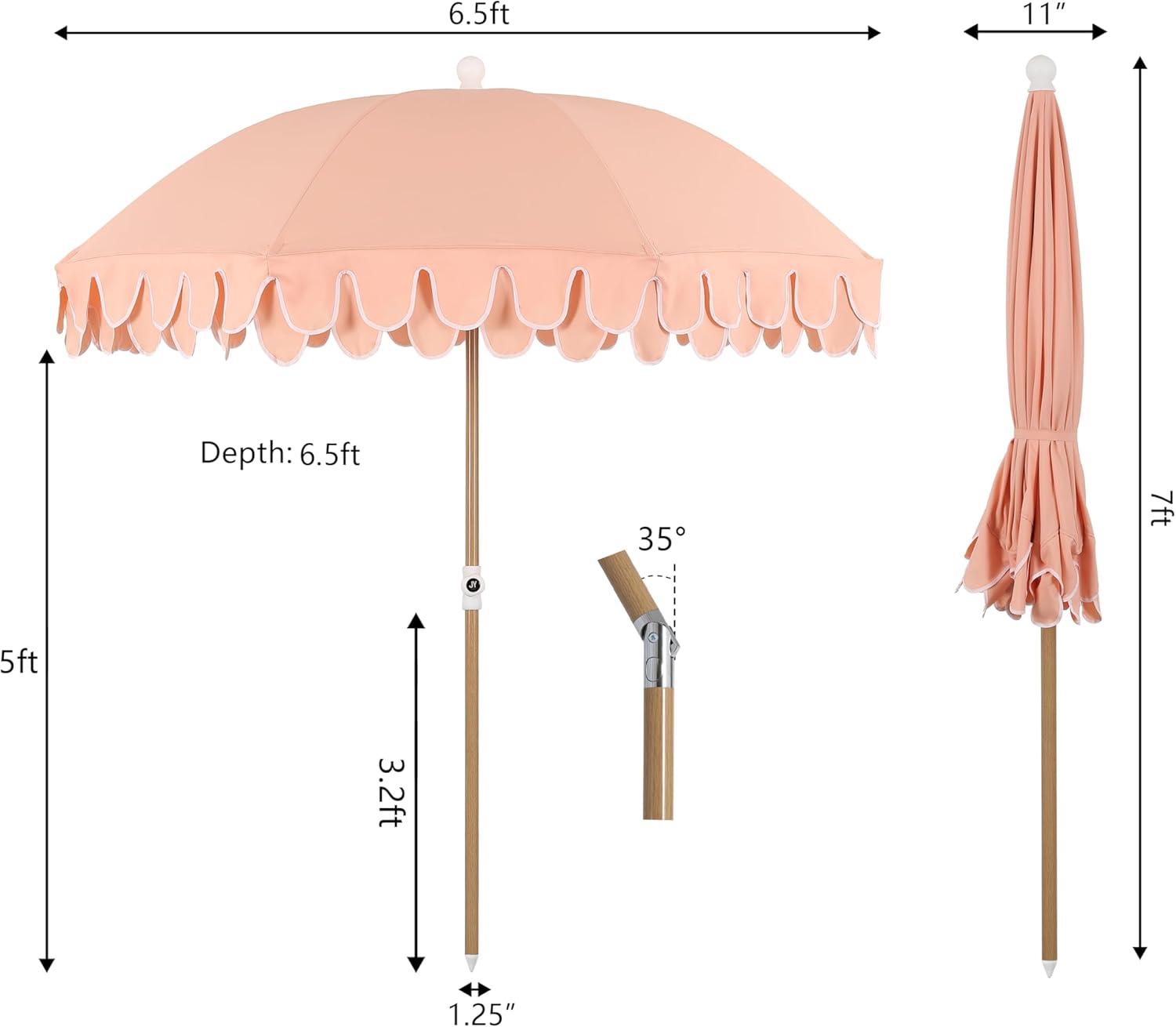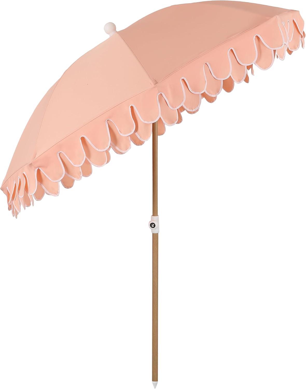 JONATHAN Y UMB1004H Horizon 6.5 ft. Classic MidCentury Scalloped Fringe Market Beach Umbrella with Push-Button Tilt, Wind Vent and UV Protection, and Matching Carry Bag in Coral Pink/White, Brown Pole(Coral Pink)