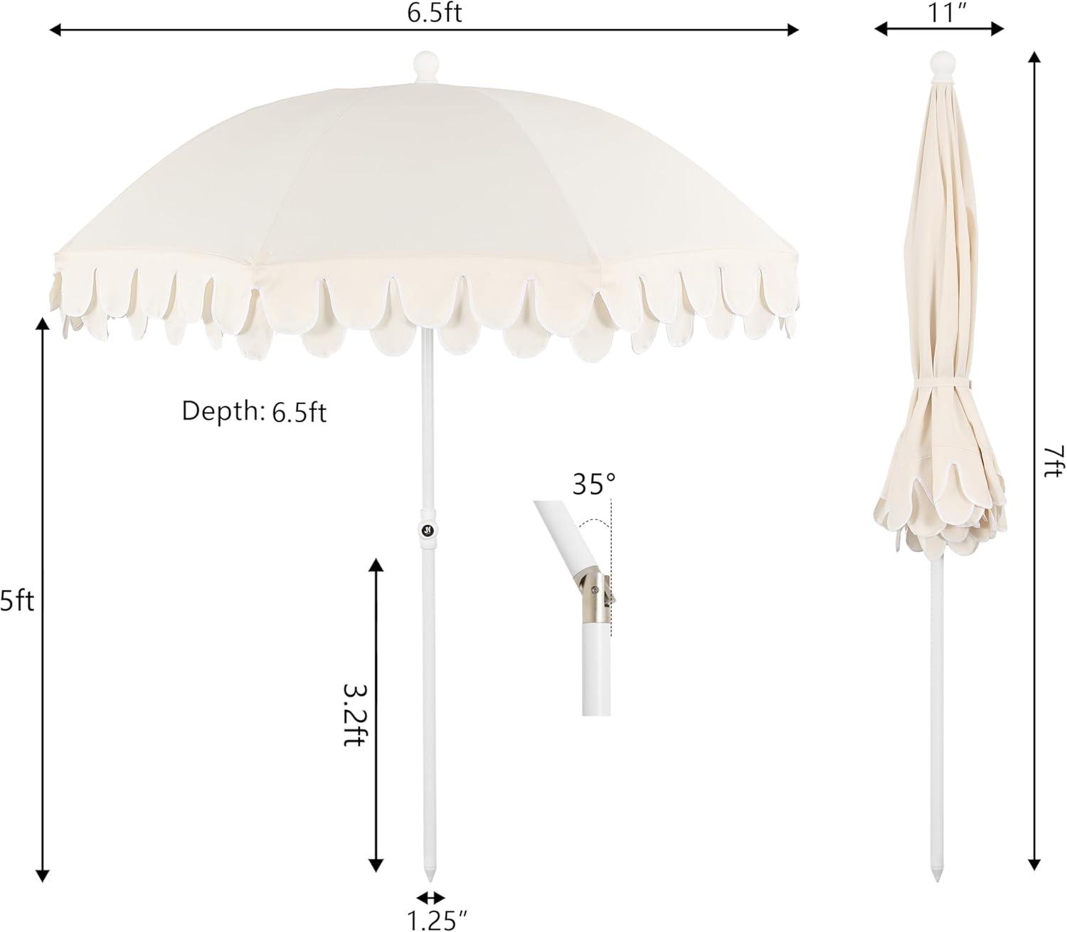 JONATHAN Y UMB1004H Horizon 6.5 ft. Classic MidCentury Scalloped Fringe Market Beach Umbrella with Push-Button Tilt, Wind Vent and UV Protection, and Matching Carry Bag in Coral Pink/White, Brown Pole(Cream)