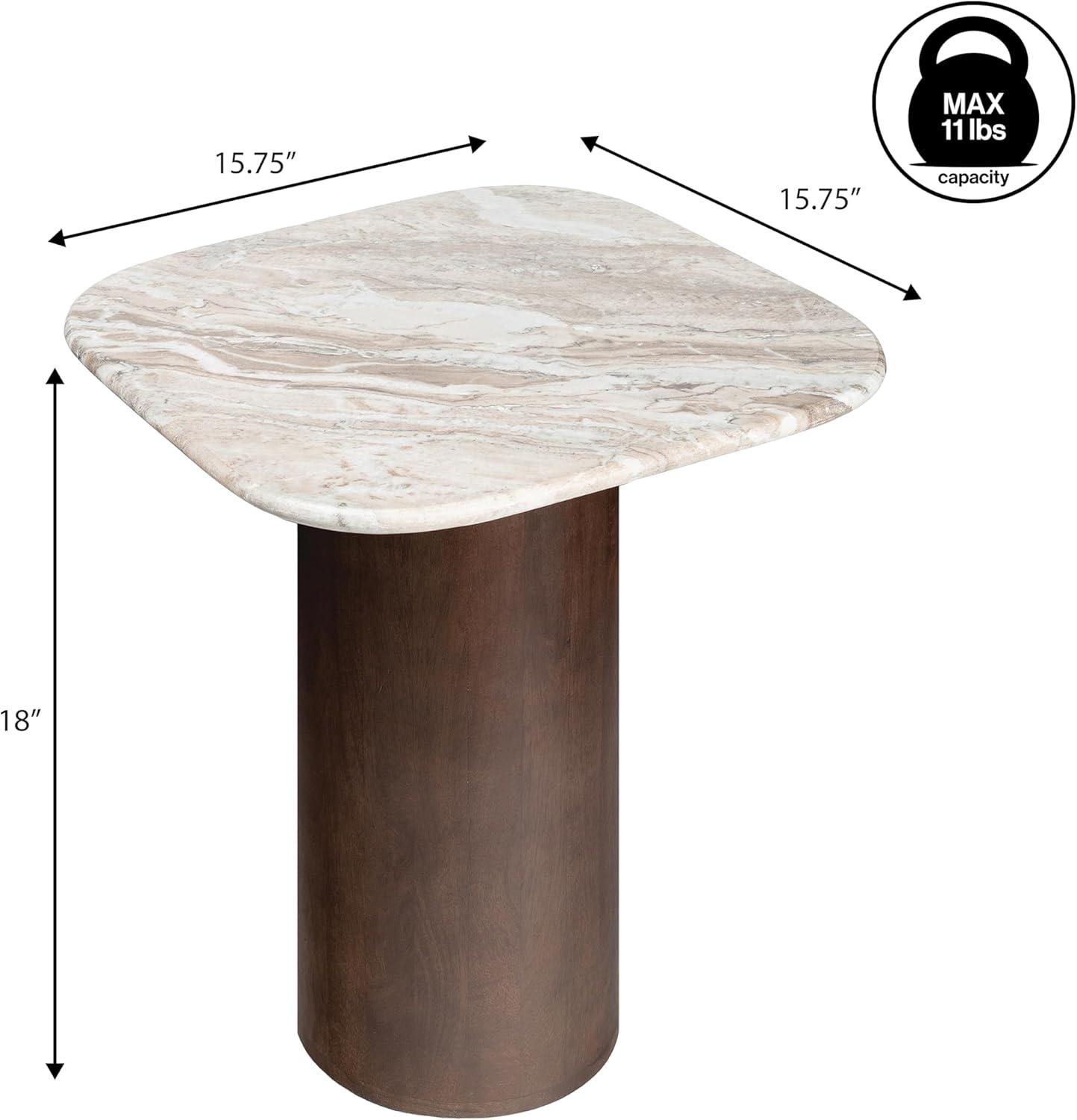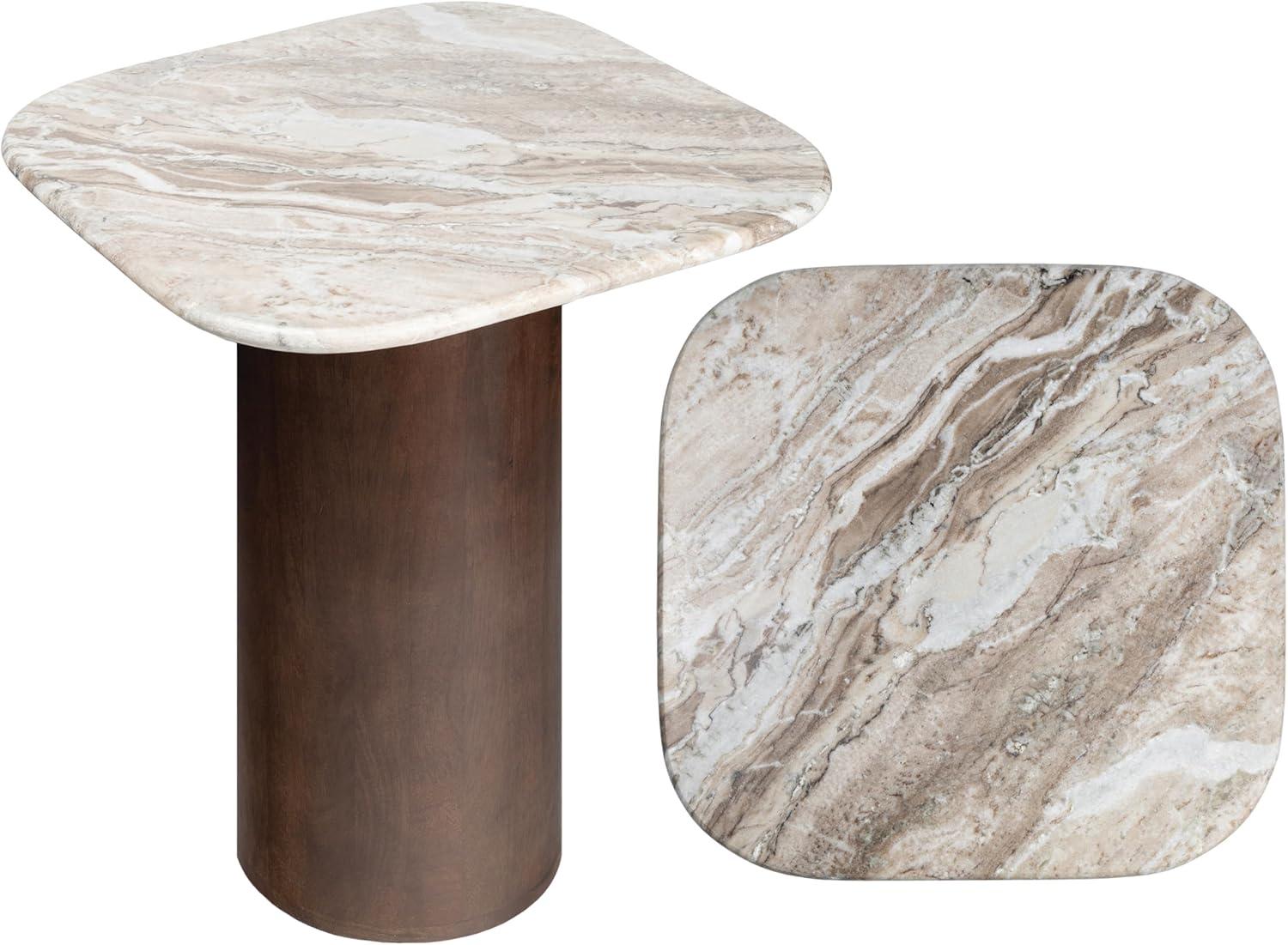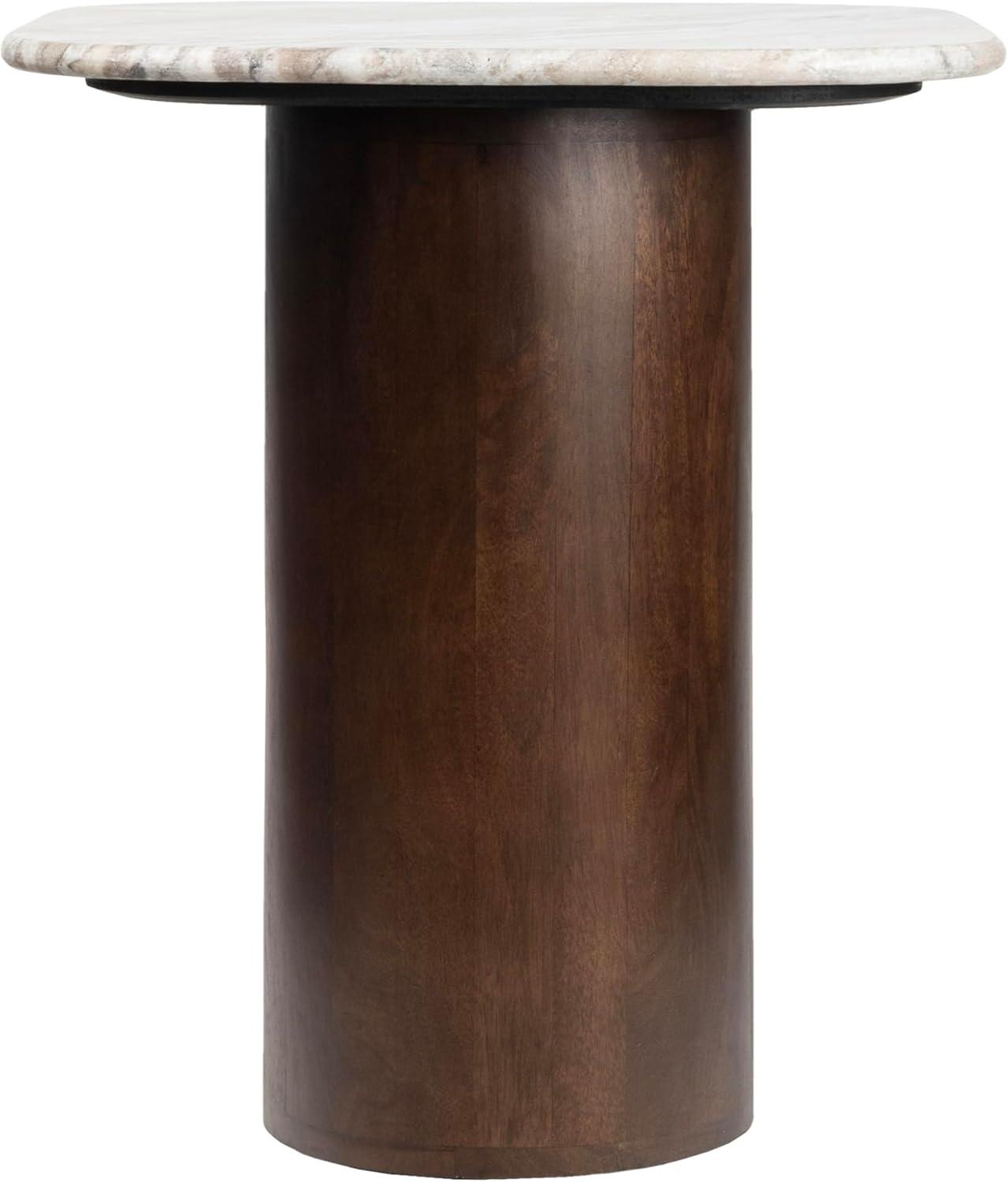 The mango wood base has a walnut brown stain, while the transitional marble top blends white, gray and brown veining