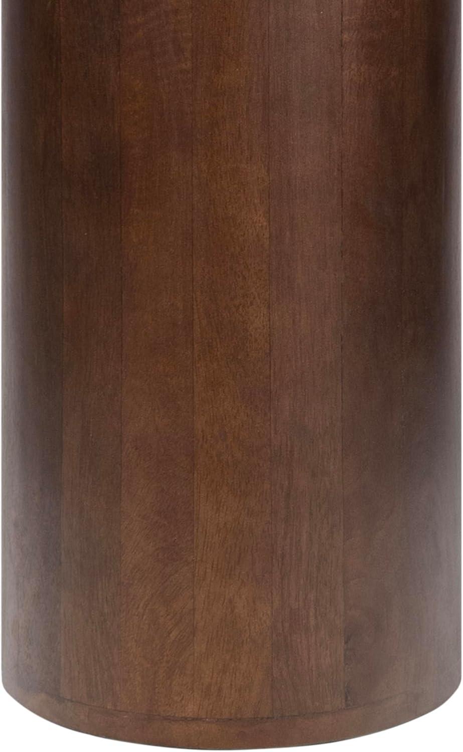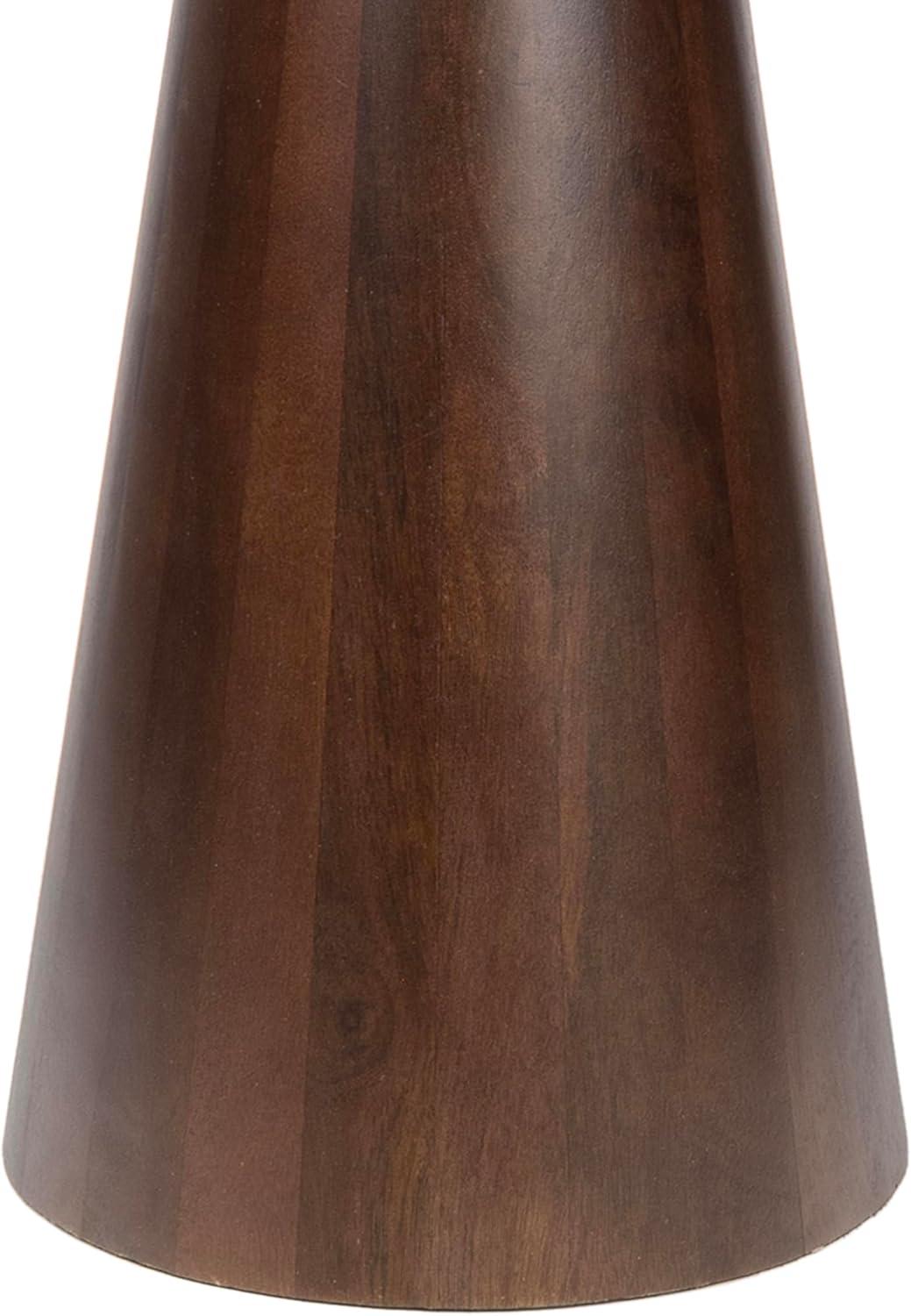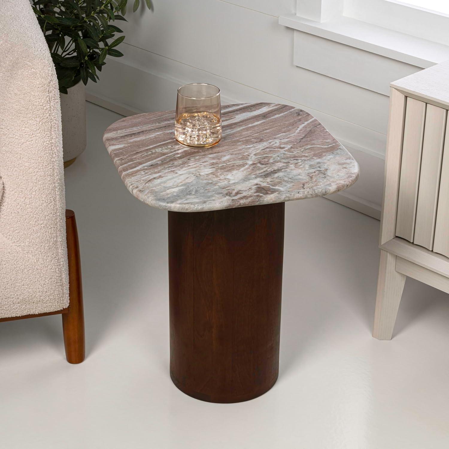 The mango wood base has a walnut brown stain, while the transitional marble top blends white, gray and brown veining