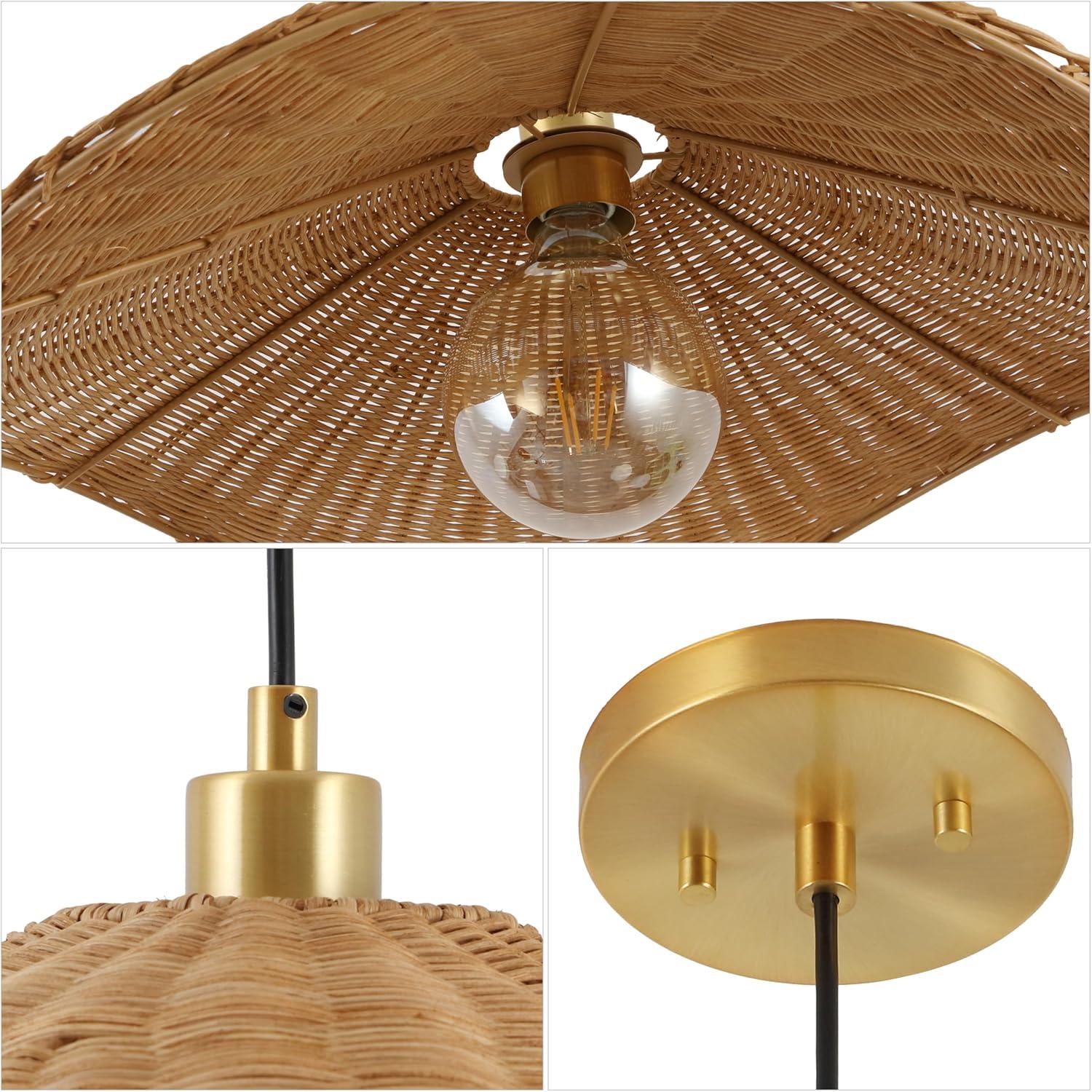 Vintage style brass-gold fittings and a brown cord are accented by a natural brown rattan shade