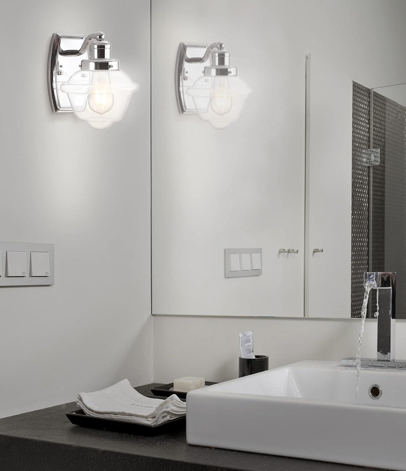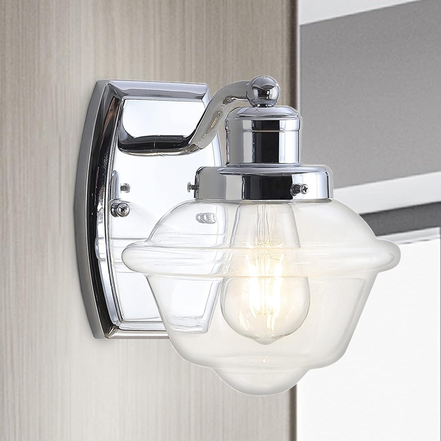 Bring on the mid-century flair with our sparkling chrome wall light. A single Edison-style LED bulb casts a warm glow. The schoolhouse style clear glass globe adds vintage style to your bath vanity, kitchen, hallway or entry.