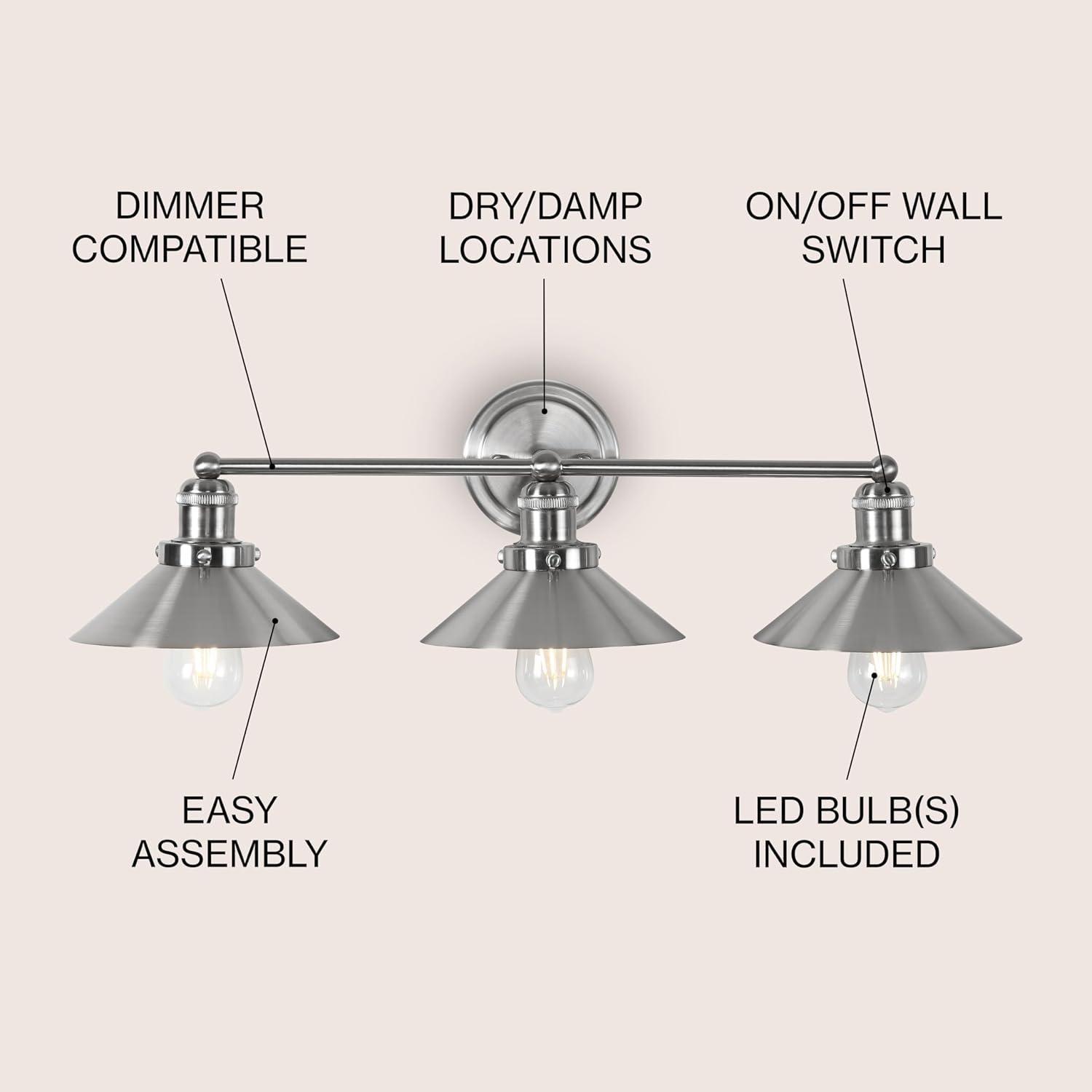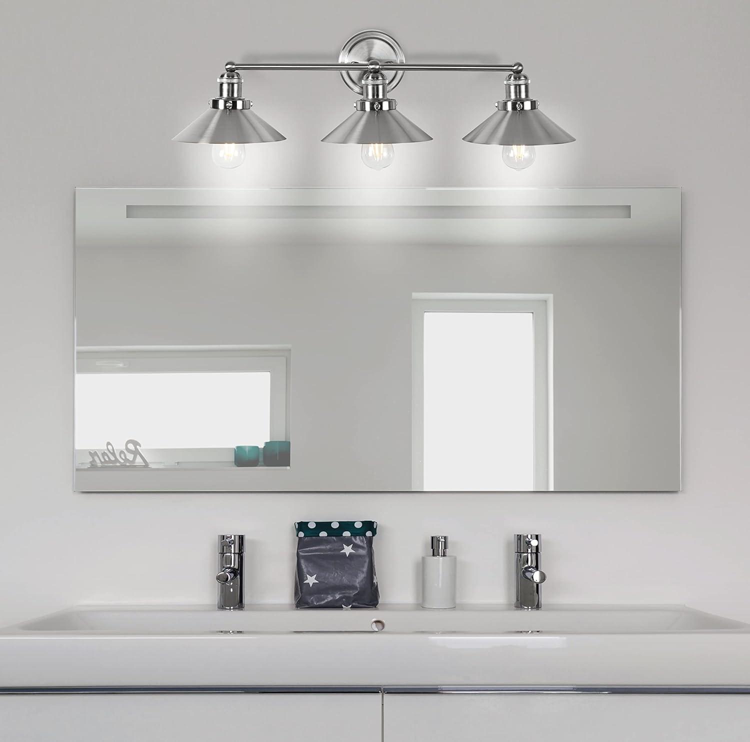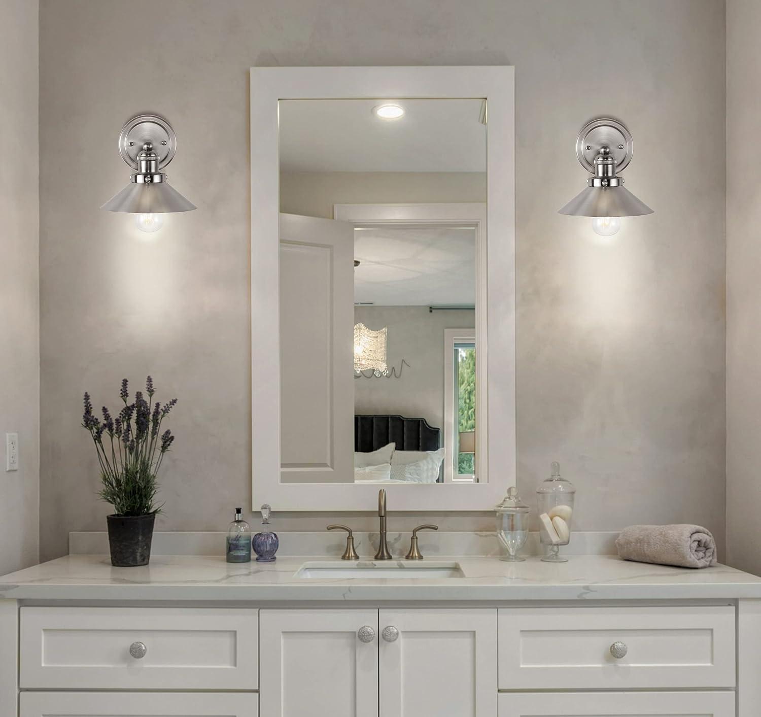This dynamic design features a metal cone shade that conceals the top half of the bulb perfect for a polished industrial look. In a shiny chrome finish, this sconce is perfectly at home above a bathroom mirror or as extra lighting in kitchens, where your hardware truly shines. Also available in other single and multi-light configurations, the geometric shape adds elegant interest to any space.