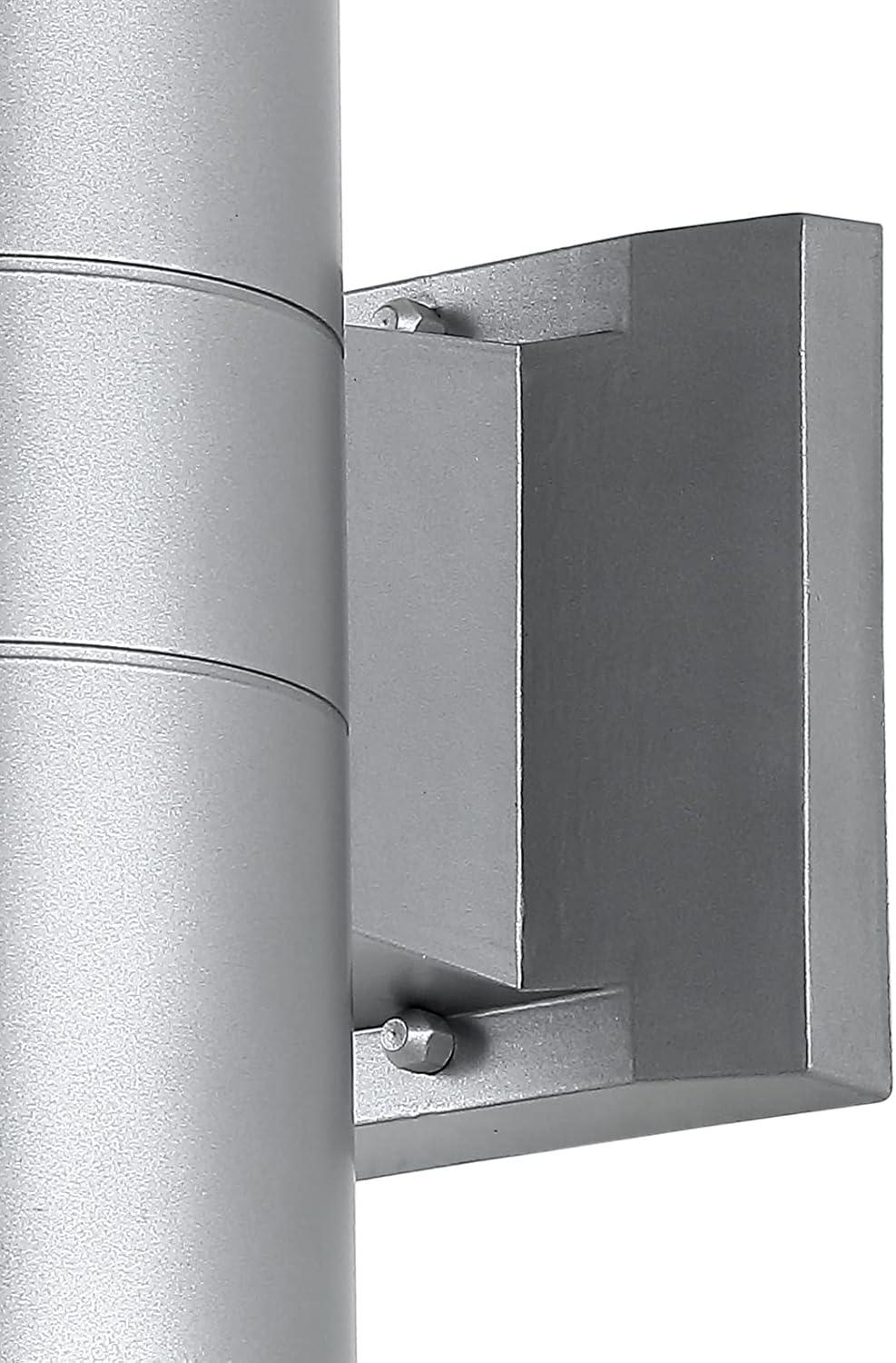 Understated and functional, this silver cylindrical wall light shines both up and down. Solid metal construction features a sturdy square backplate and glass covers for the bulbs. Ideal as accent lighting for a courtyard or wall; use several to illuminate your home's architecture.