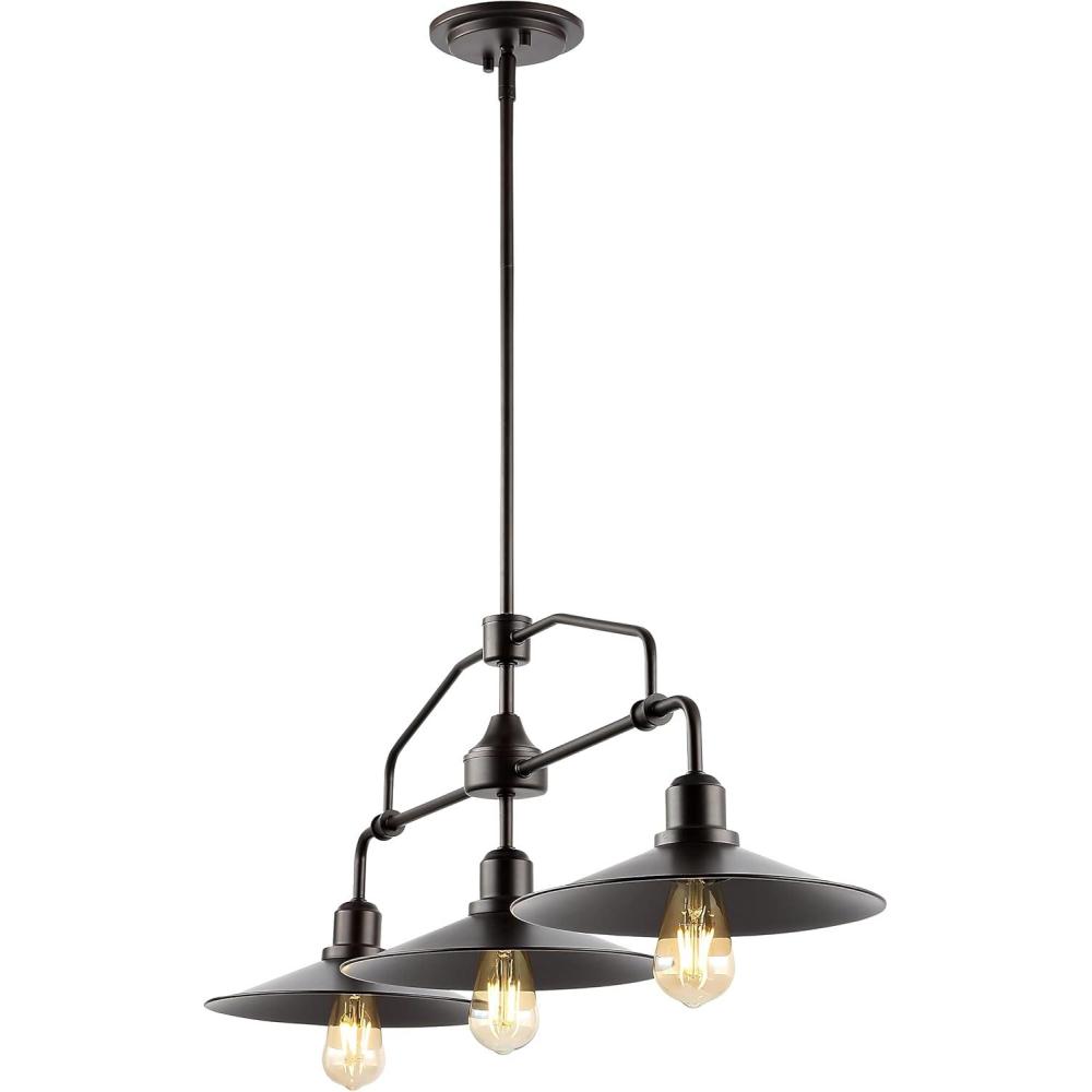 At just over three-feet long, this linear pendant chandelier is perfectly sized for hanging over a kitchen island, small dining room, or study room. It features three Edison-style LED bulbs in flared metal shades arranged on a vintage-style frame. This versatile ceiling light is a fine addition for your modern farmhouse or industrial interior design.