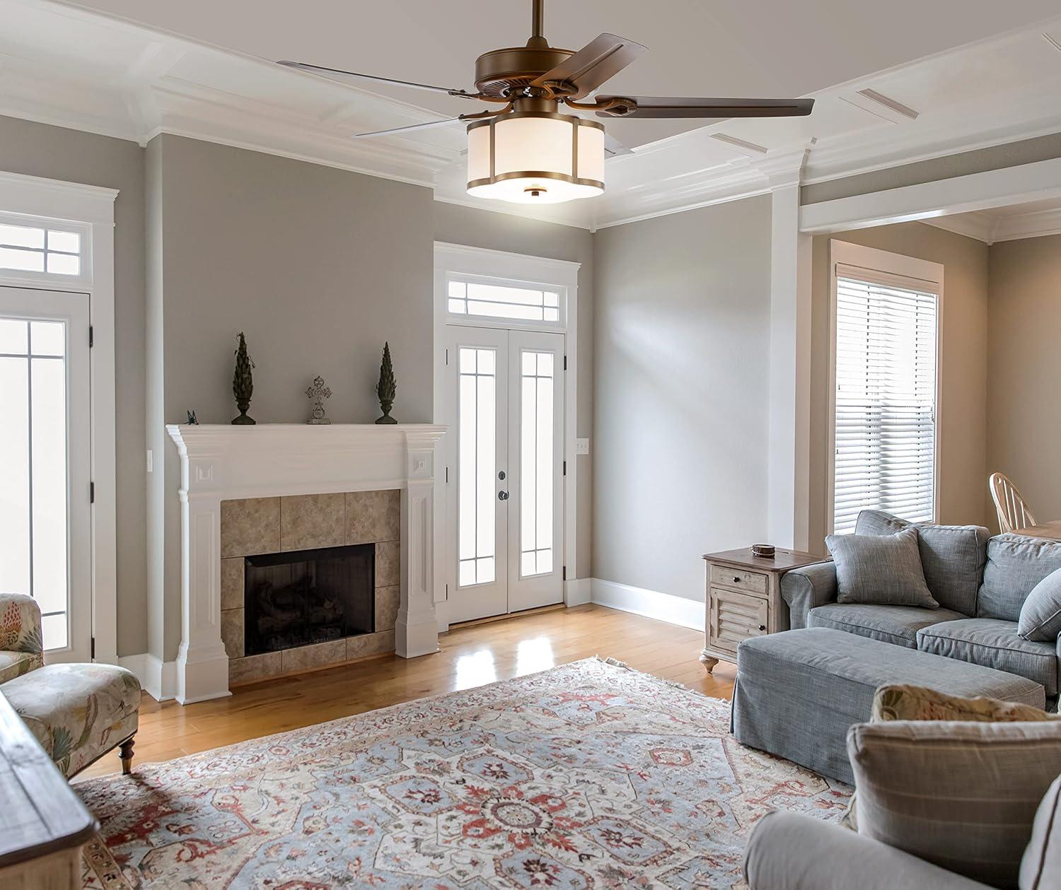 Our 52″ bronze ceiling fan's tailored design has a trendy scalloped-drum lamp shade for an elegant, modern finish. Five reversible blades provide plenty of air flow by remote control. A diffuser panel conceals 3 LED light bulbs for a polished look.