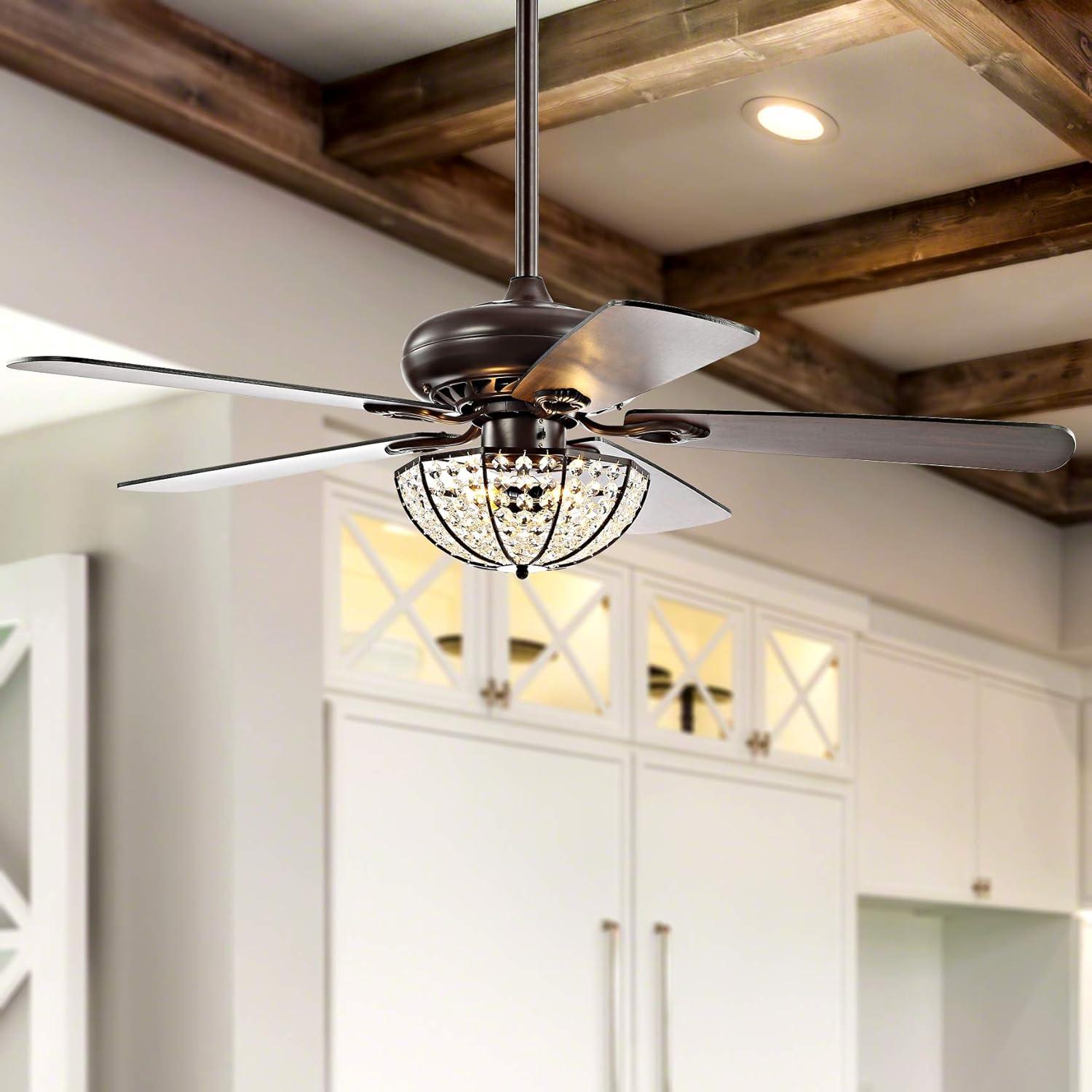 Our 52″ Oiled Bronze fan combines rustic style and a touch of glam, featuring a domed cage light embellished with crystal drops. Five reversible blades provide plenty of air flow by remote control. Three LED bulbs provide bright, sparkling light.
