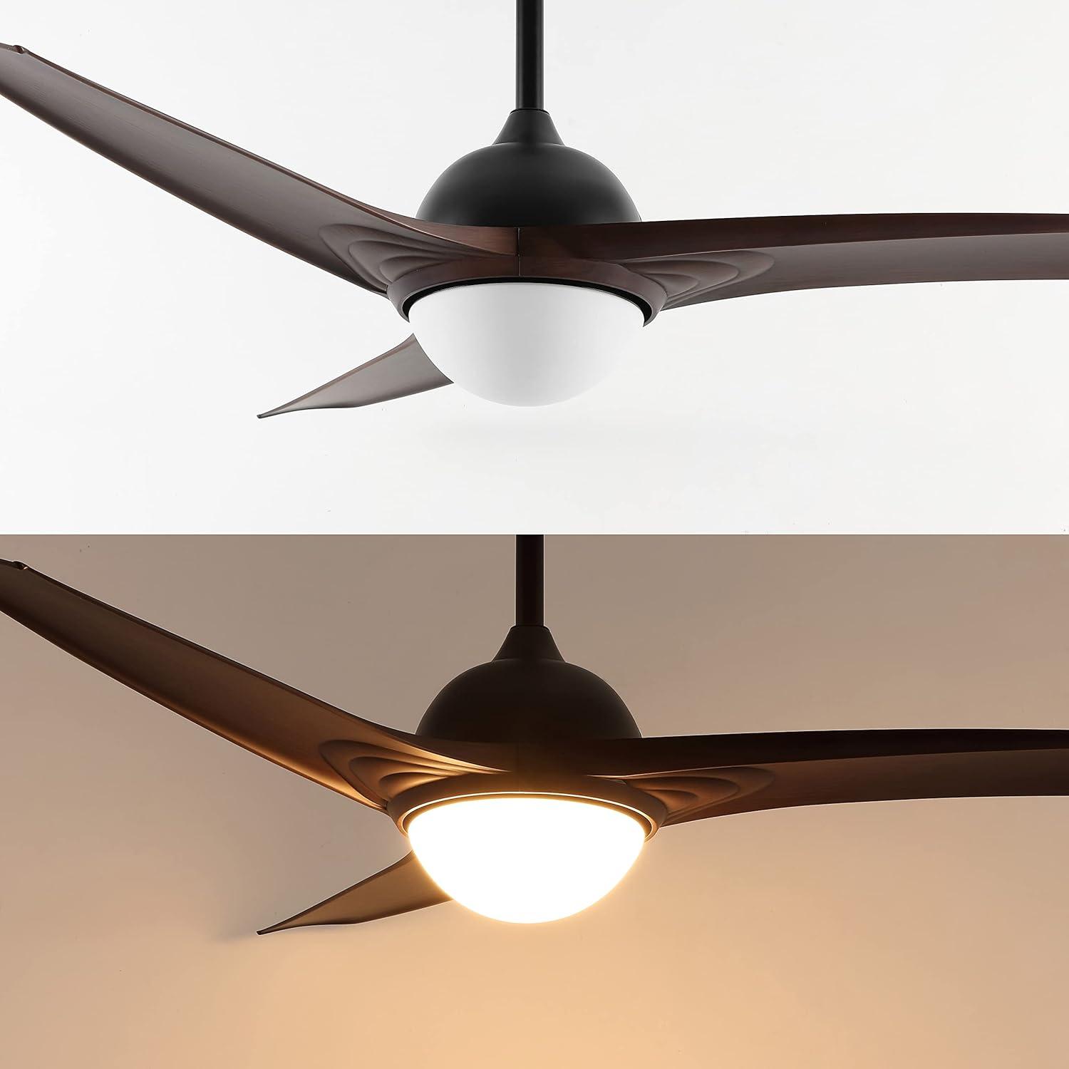 This 52″ ceiling fan is a modern three-blade design that resembles a propeller. The integrated LED lighting gives off bright, warm light and lasts for years, with bulbs that never need replacing. The handy remote control lets you easily control lighting and airflow rate.