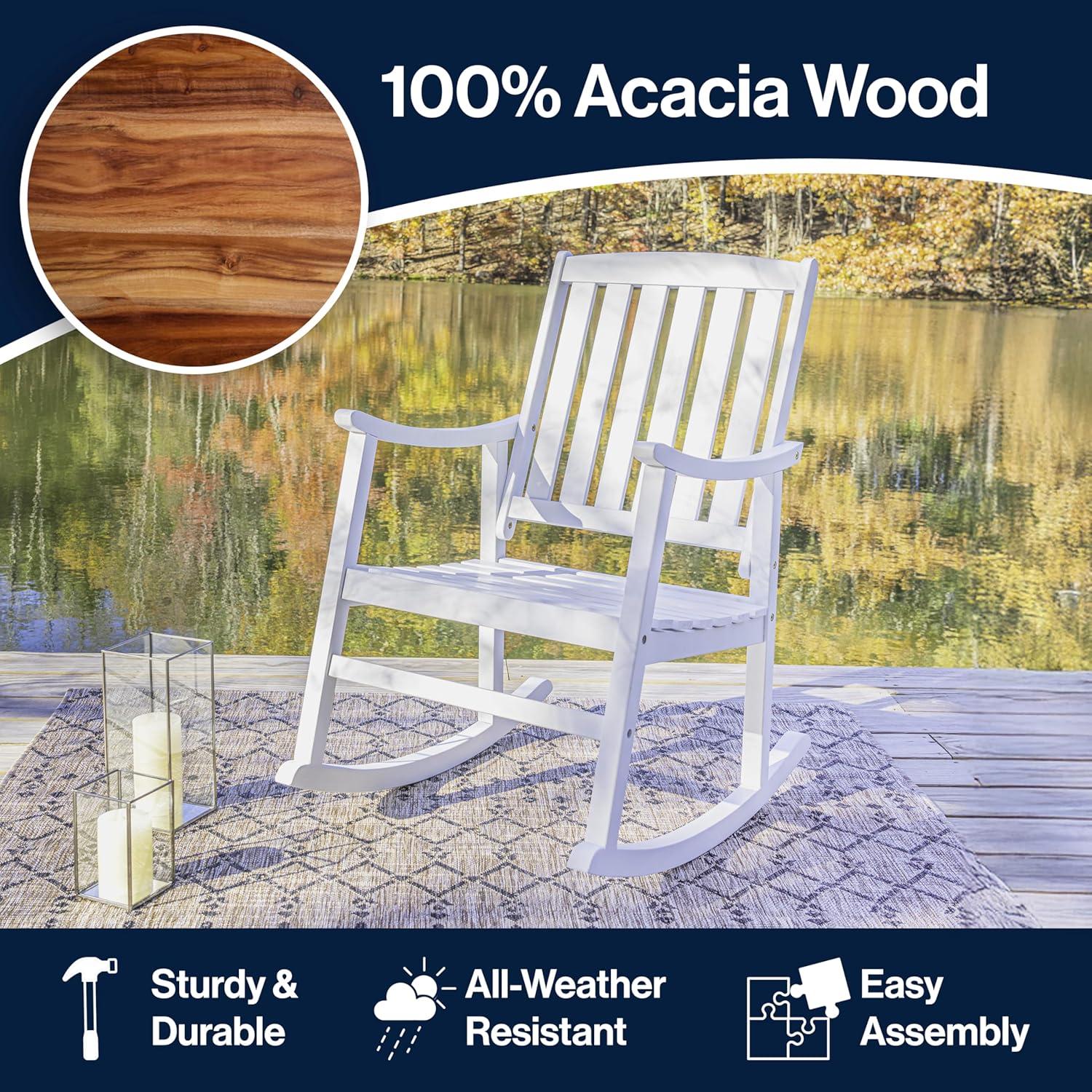 This slat-back rocking chair is a classic addition to your porch, deck or patio. The arms have a gently curved silhouette for extra comfort. Handcrafted from durable acacia wood, this chair's sturdy construction is built to last.