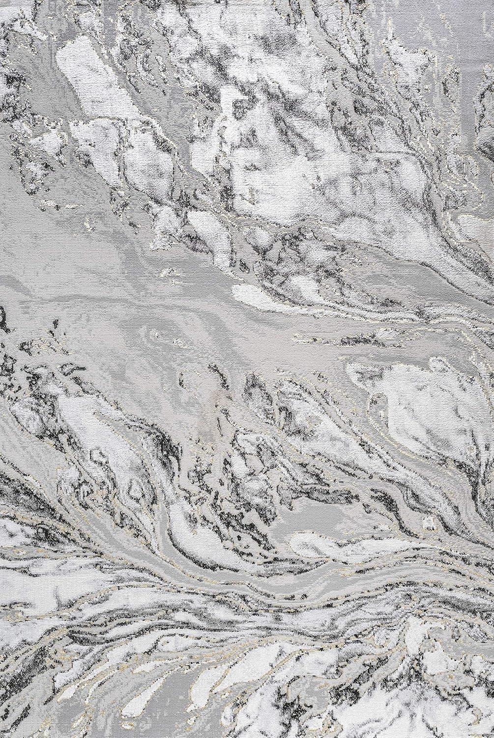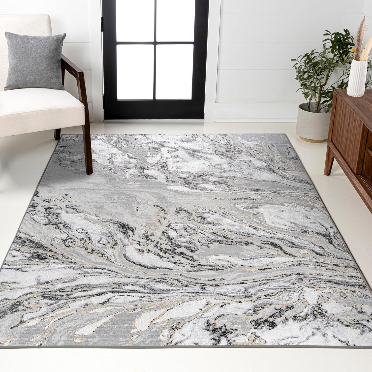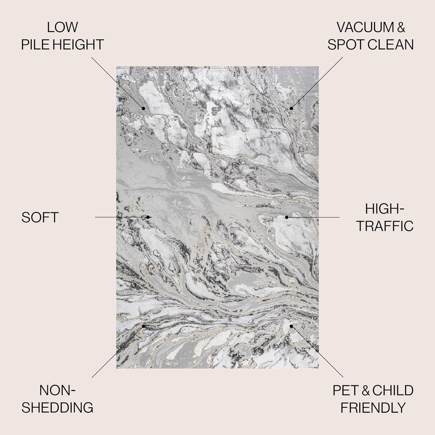 Inspired by the abstract designs of marbled papers, this bold rug has a modern, coastal vibe. Deep charcoal and gray swirl across an ivory background. This unique rug's overall pattern makes it perfect for homes with kids and pets. It's the perfect centerpiece for a mid-century modern, contemporary, beach house or minimalist interior.